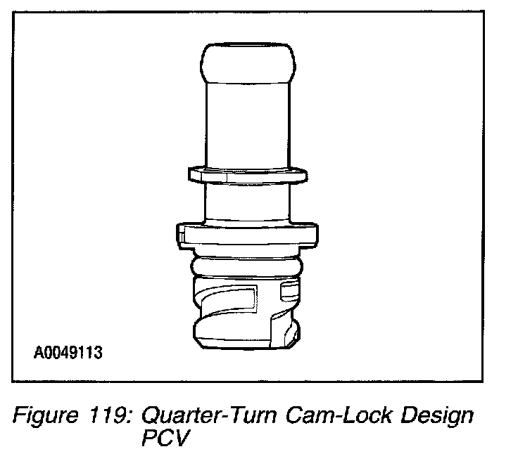 NOTE: PCV systems that comply with OBD PCV monitoring requirements will use a quarter-turn cam-lock thread design at one end to prevent accidental disconnection from the rocker cover. For more information about the PCV monitor refer to PCV System Monitor.