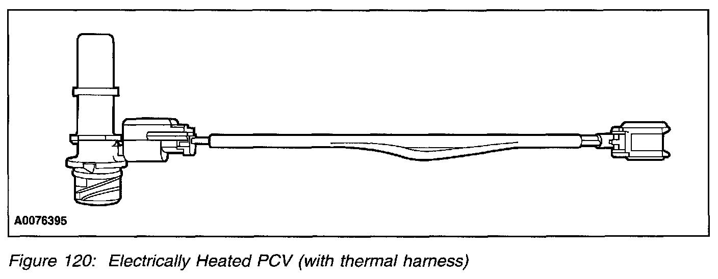 - Thermal harness controlled - On vehicle application that are equipped with a thermal harness to the PCV valve. The thermal harness only provides electrical continuity to the heating element when temperature are less than 40°F (5°C +/- 7°F (+/- 4°C)). Typically this harness is located close to the PCV valve.