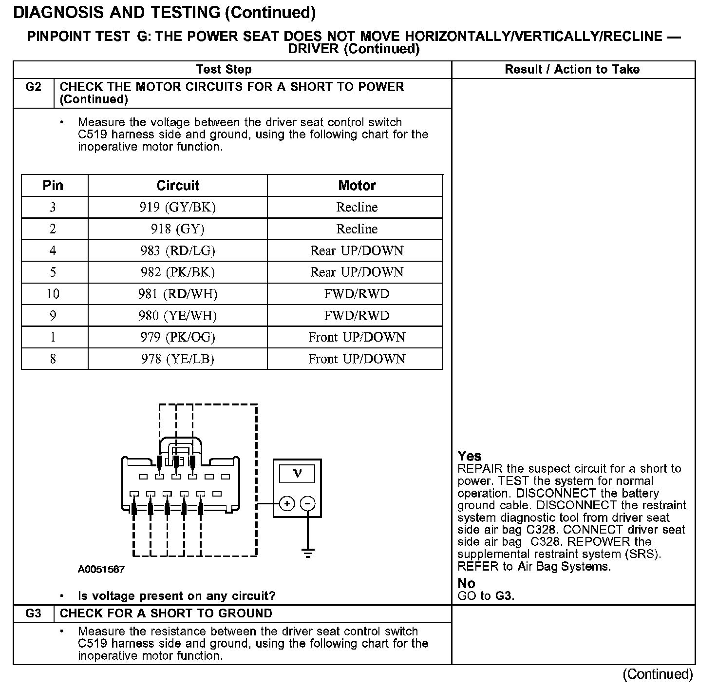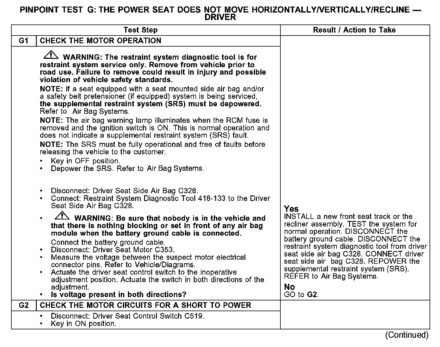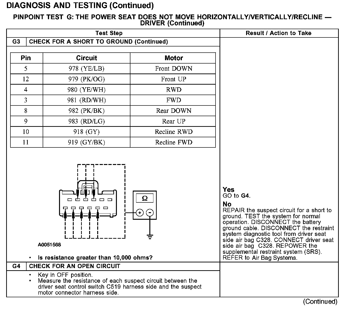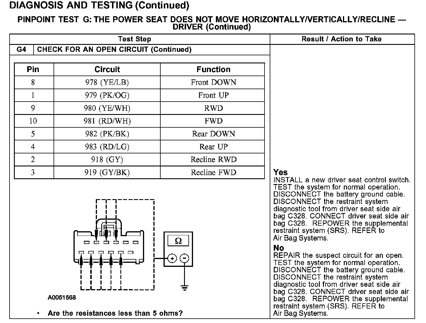PINPOINT TEST G: THE POWER SEAT DOES NOT MOVE HORIZONTALLY/VERTICALLY/RECLINE - DRIVER