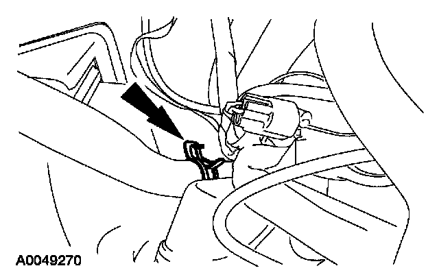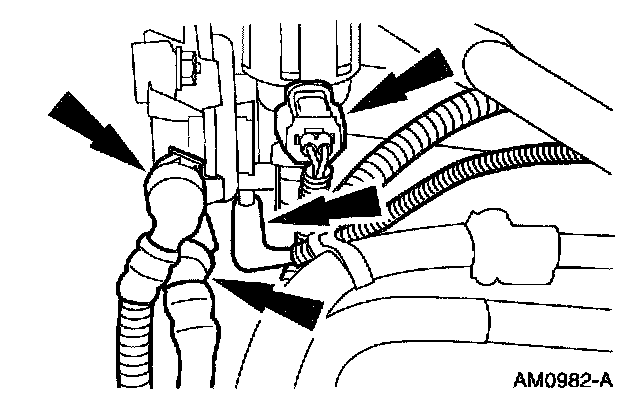 2. Disconnect the vacuum hoses and the wire harness connector from the evaporative emission canister purge valve (EVAP canister purge valve).