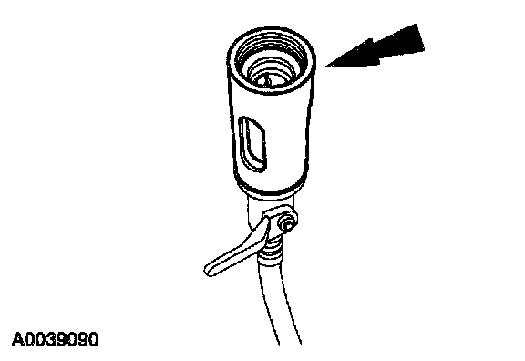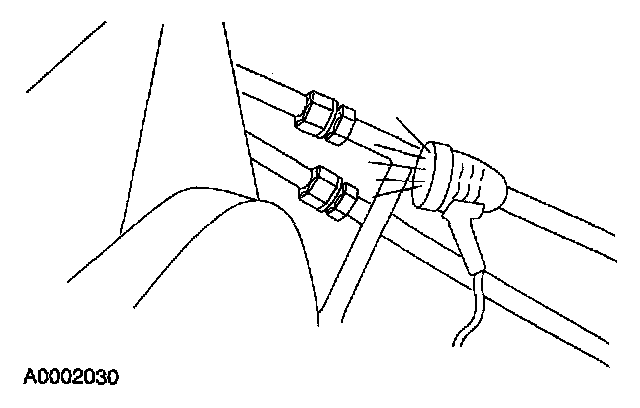 8. Remove the fluorescent dye injector from the low-pressure service gauge port valve and the R-134a A/C refrigerant service center or manifold gauge set.