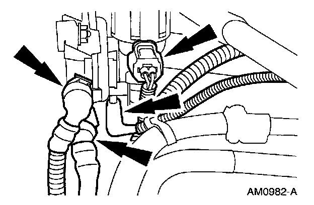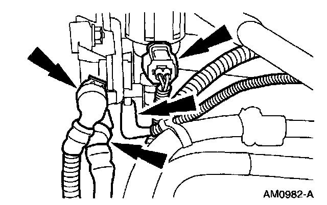 4. Disconnect the vacuum hoses and the wire harness connector from the evaporative emissions canister purge valve.