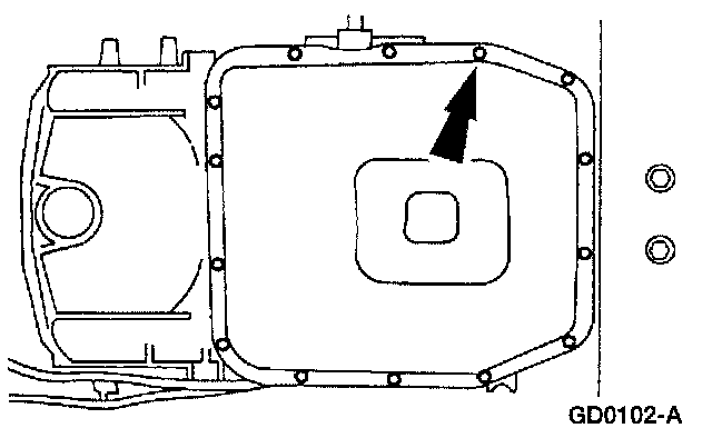 ^ Loosen the transmission fluid pan bolts and allow the fluid to drain. After fluid has drained remove the bolts and the pan and drain the remaining fluid that is in the pan.
