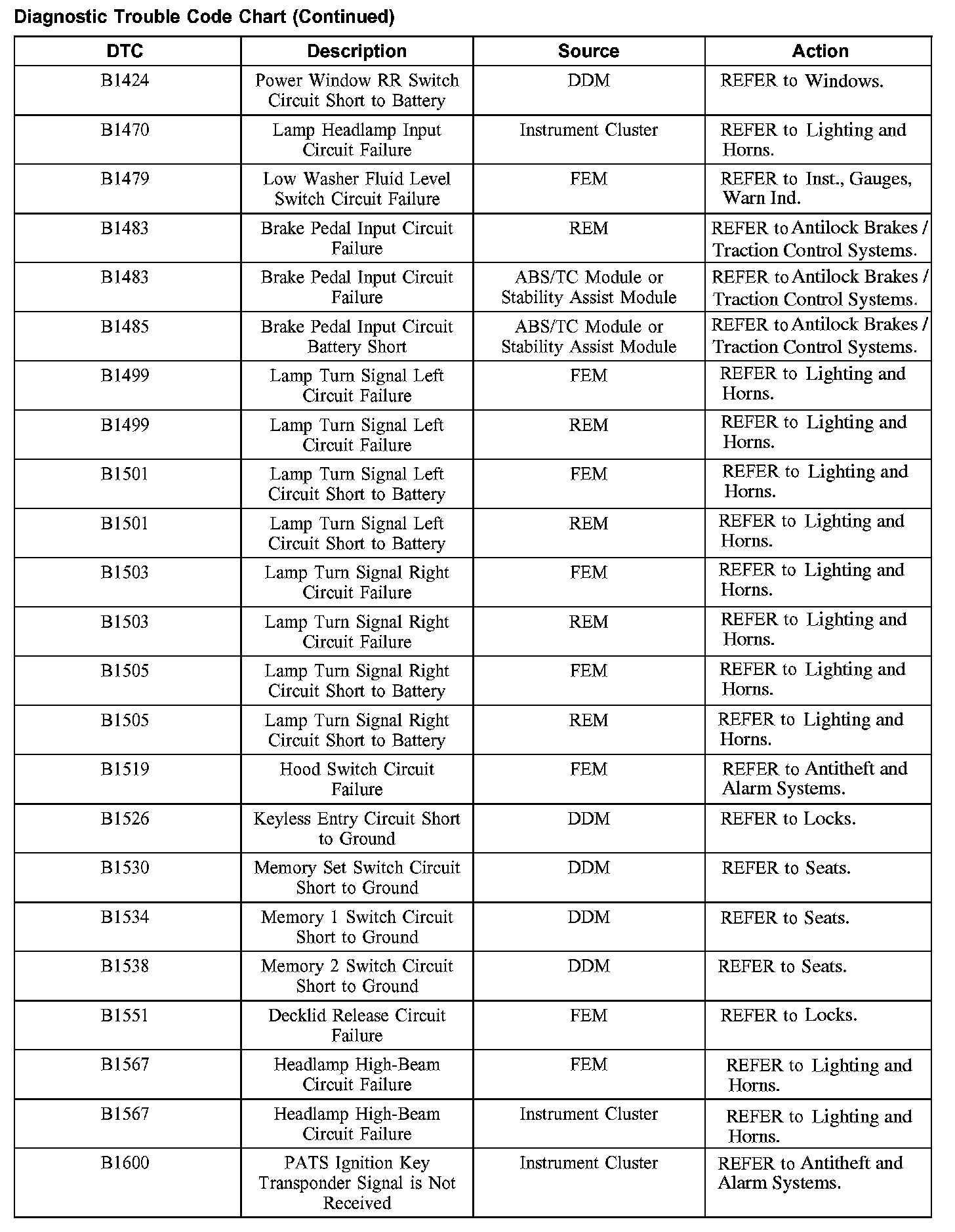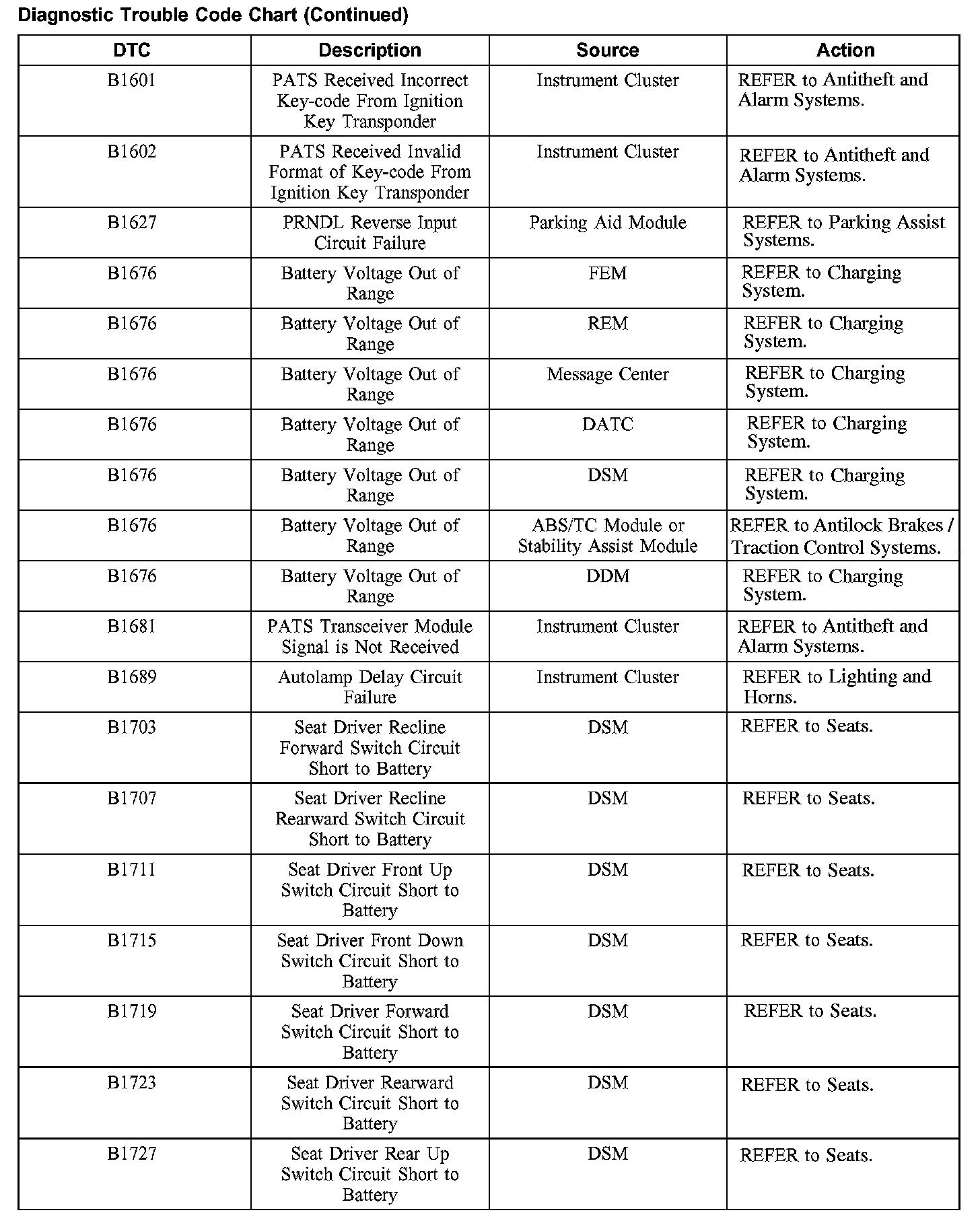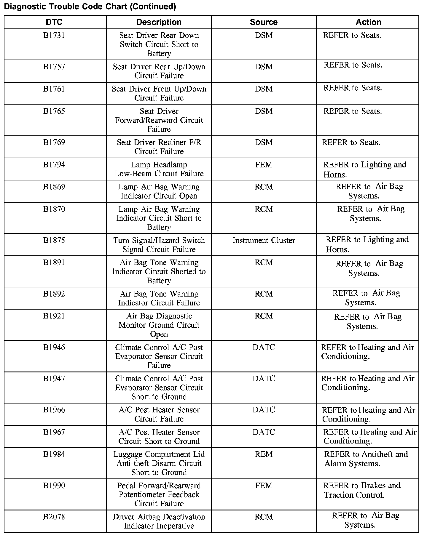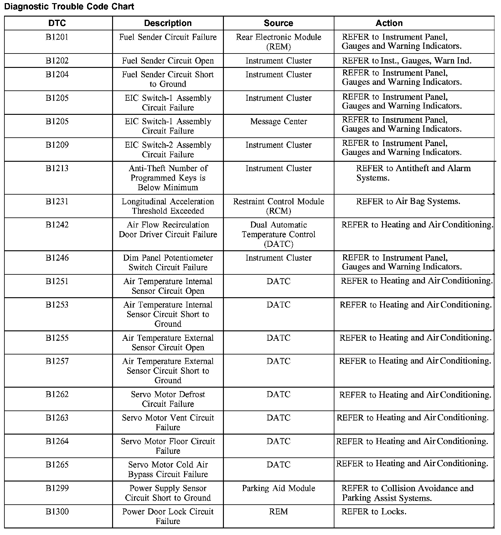 DIAGNOSTIC TROUBLE CODE CHARTB1201-B1300: