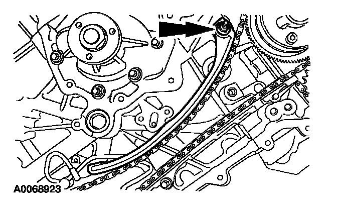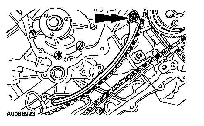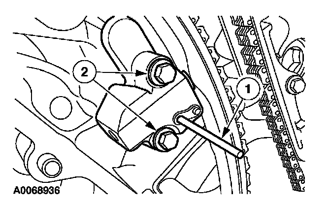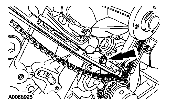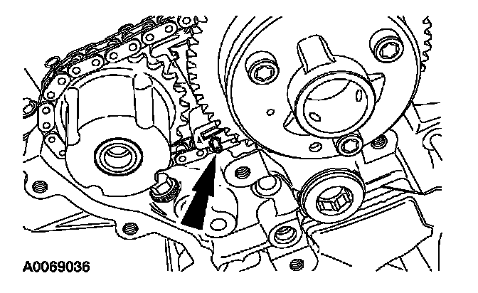 23. Collapse the RH secondary timing chain tensioner and install a pin to lock the piston.