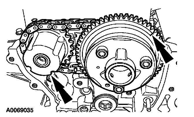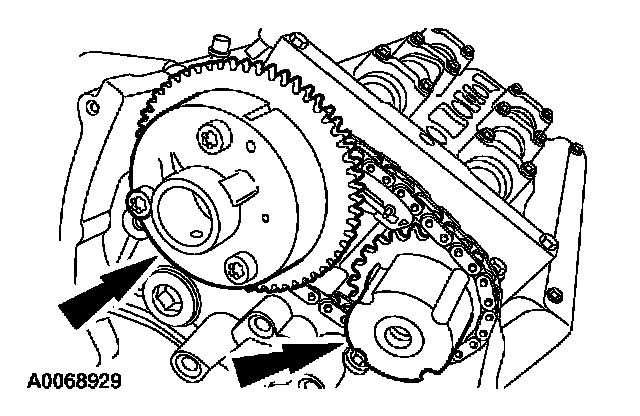 6. Install the RH VCT unit, exhaust camshaft sprocket and timing chain as an assembly.
