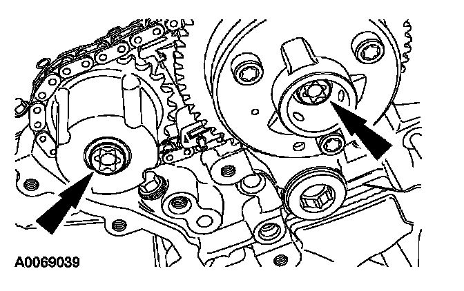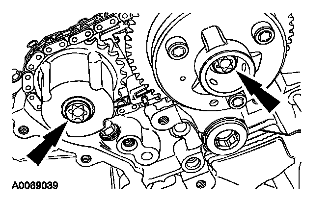 3. Using new bolts, install the LH VCT unit and exhaust camshaft sprocket bolts finger tight.