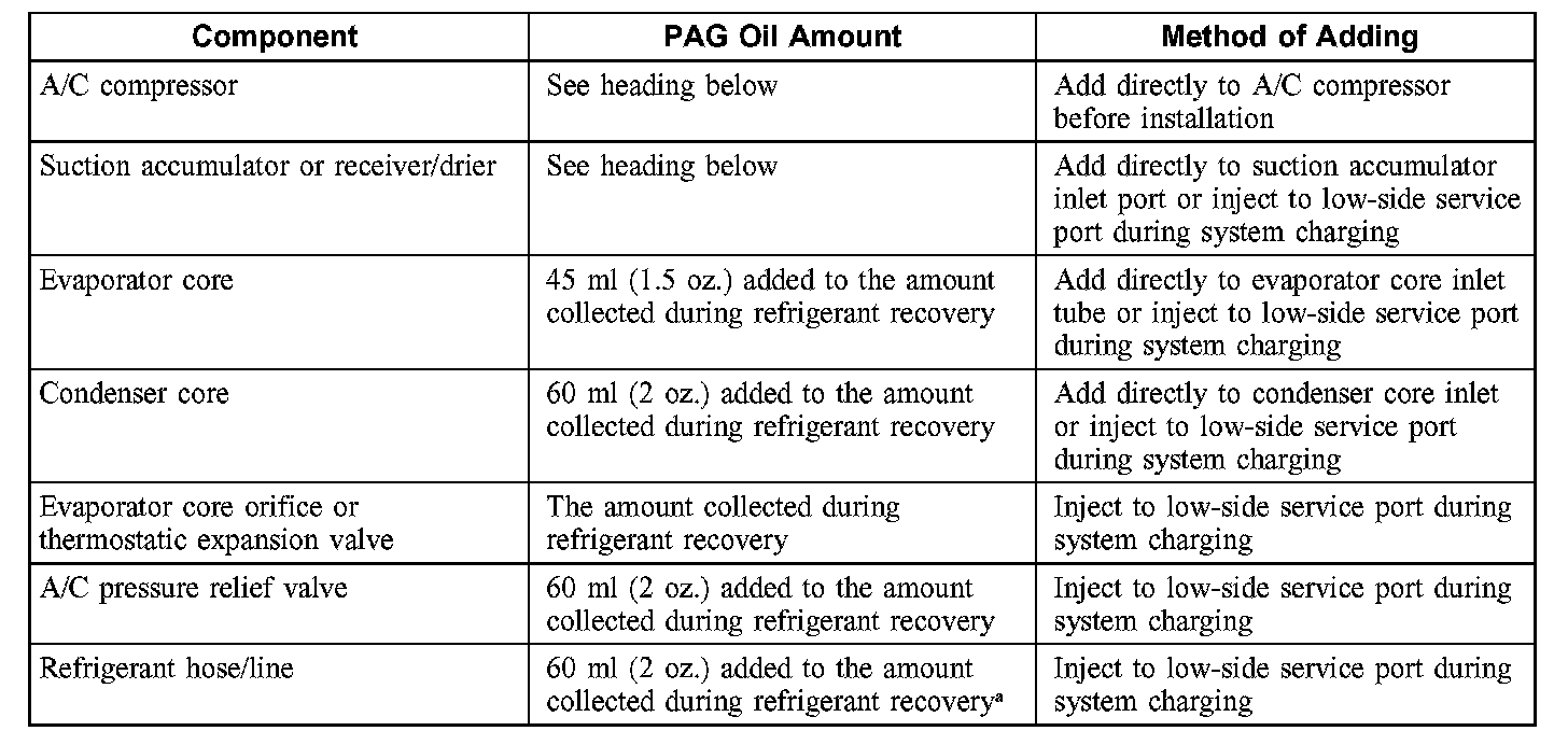 CAUTION: During normal A/C operation, oil is circulated through the system with the refrigerant, and a small amount is retained in each component. If certain components of the system are removed, some of the refrigerant oil will go with the component. To maintain the original total oil charge, it is necessary to compensate for the oil lost by adding oil to the system with the new part.