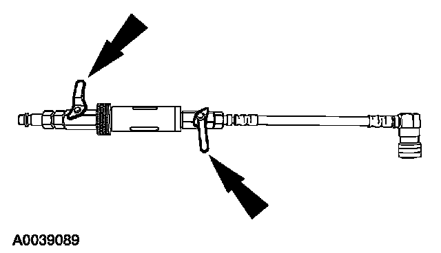 5. Install the dye/lubricant injector between the low-side service gauge port valve and the refrigerant service station or manifold gauge set.