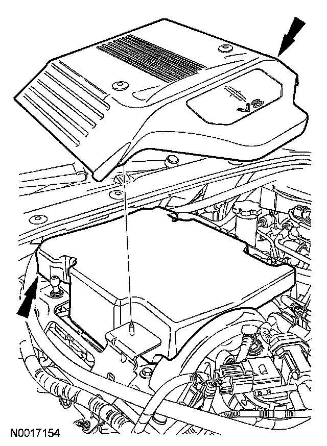 2. CAUTION: The engine appearance cover is equipped with a noise suppressor. If the noise suppressor becomes separated from the engine appearance cover it must be positioned on the intake manifold prior to installing the engine appearance cover.