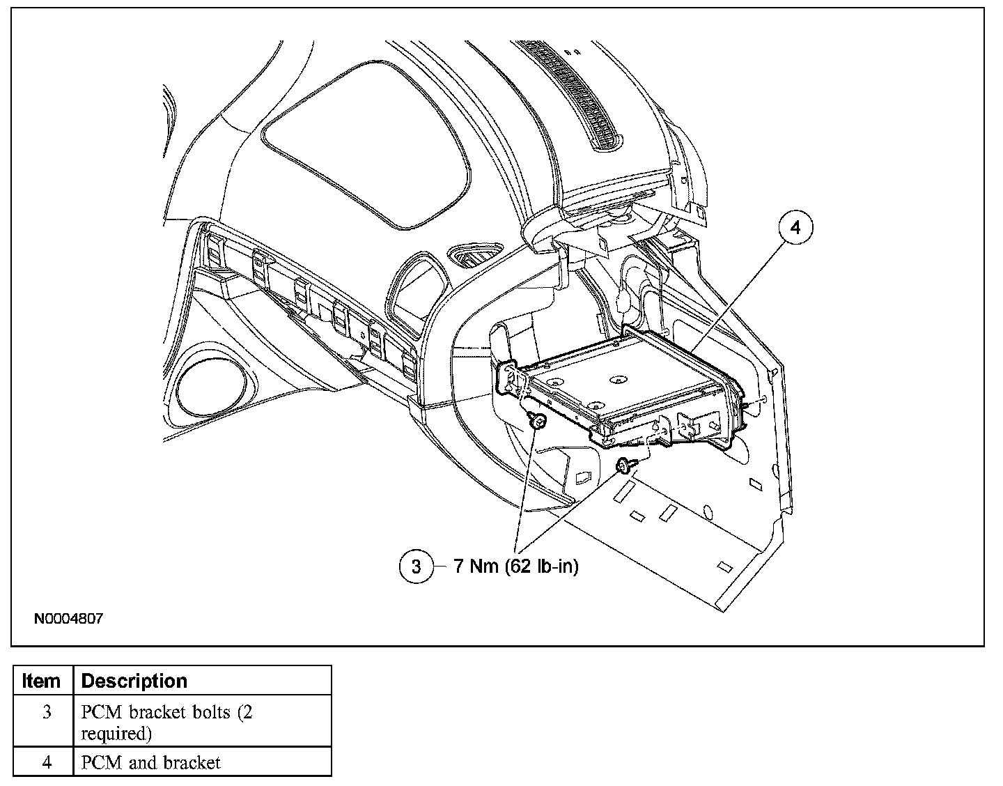 7. Remove the PCM and bracket as an assembly through the glove compartment opening.