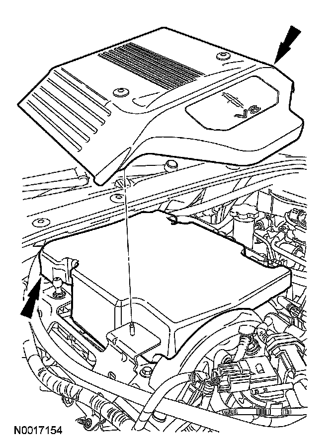 1. CAUTION: The engine appearance cover is equipped with a noise suppressor. If the noise suppressor becomes separated from the engine appearance cover it must be positioned on the intake manifold prior to installing the engine appearance cover.