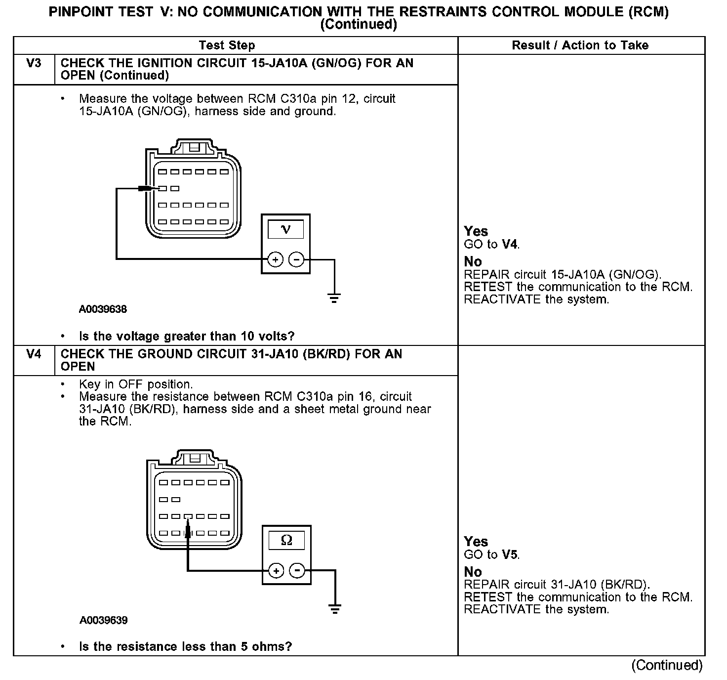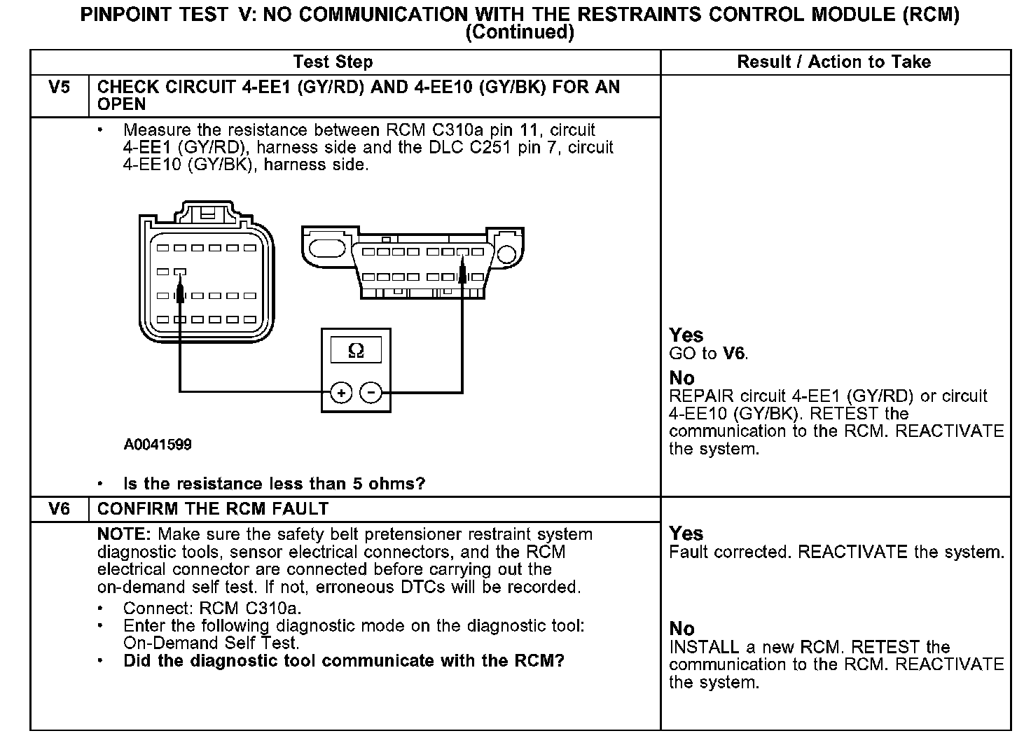 PINPOINT TEST V: NO COMMUNICATION WITH THE RESTRAINTS CONTROL MODULE (RCM)V1-V3: