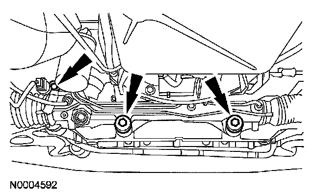7. Remove the power steering gear nuts and bolts. Discard the nuts.