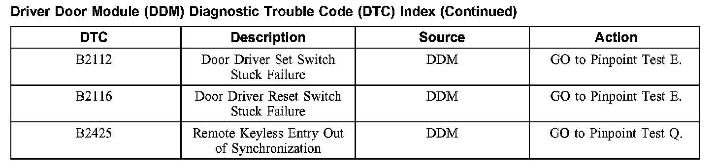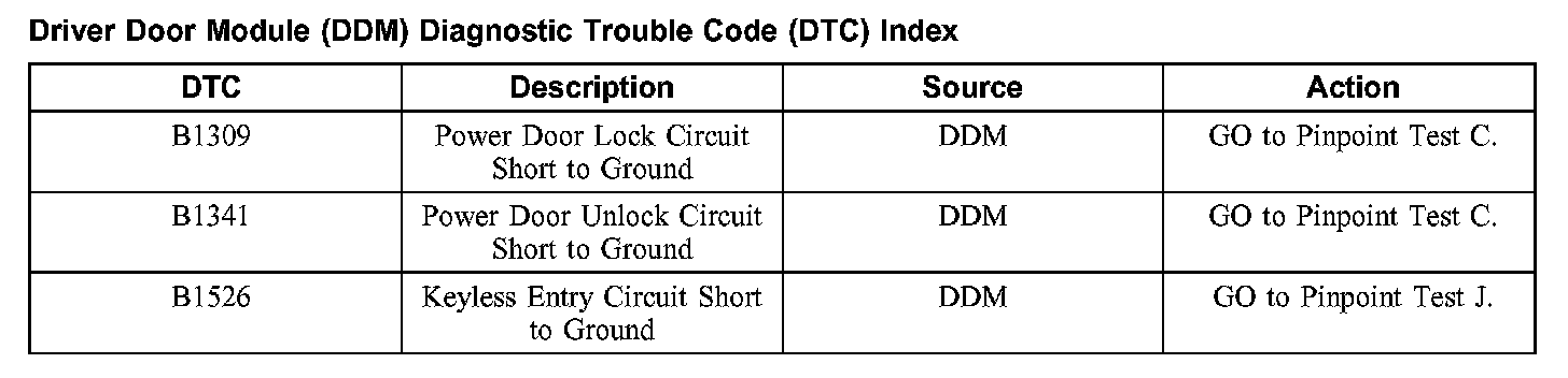 Driver Door Module (DDM) Diagnostic Trouble Code (DTC) Index