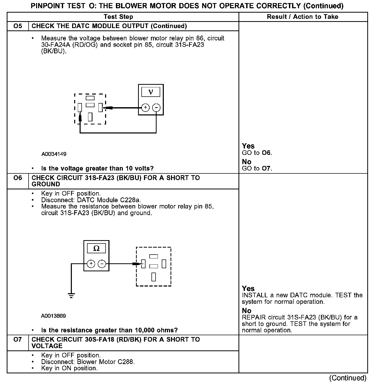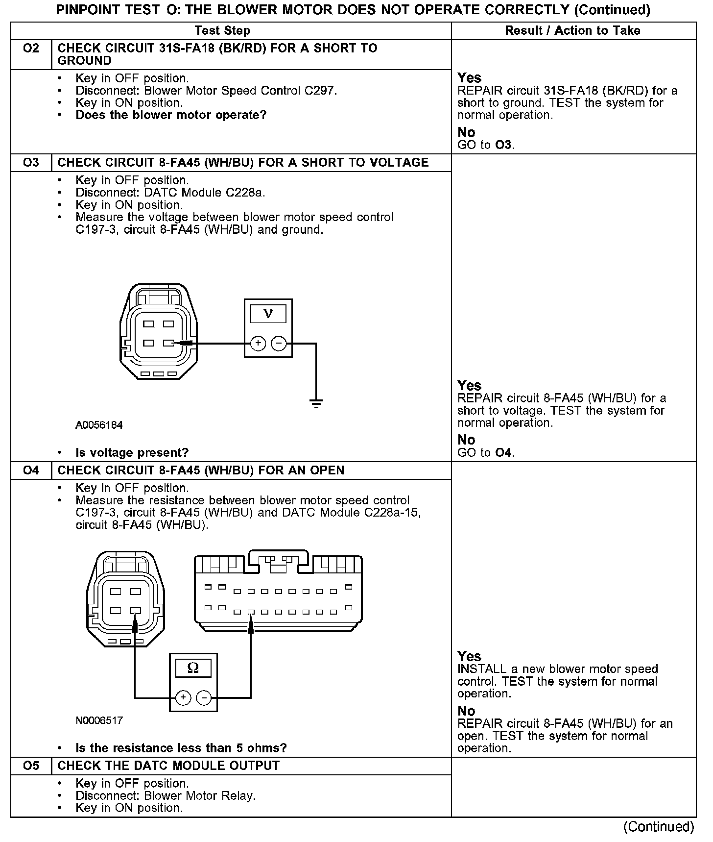 Under normal operation, the blower motor relay coil receives a ground from the DATC module through circuit 31S-FA23 (BK/BU). The coil receives voltage through circuit 30-FA24 (RD/OG). Voltage is supplied to the relay contacts from circuit 30-FA24 (RD/OG). When the relay coil is energized, voltage is delivered to the blower motor through circuit 30S-FA18 (RD/BK). Ground for the motor is provided through circuit 31S-FA18 (BK/RD) from the blower control module. Ground for the blower control module is provided by circuit 31-FA45 (BK). The DATC module sends a 0-volt (LO) to 5-volt (HI) signal to the blower control module through circuit 8-FA45 (WH/BU) to control the blower speed.