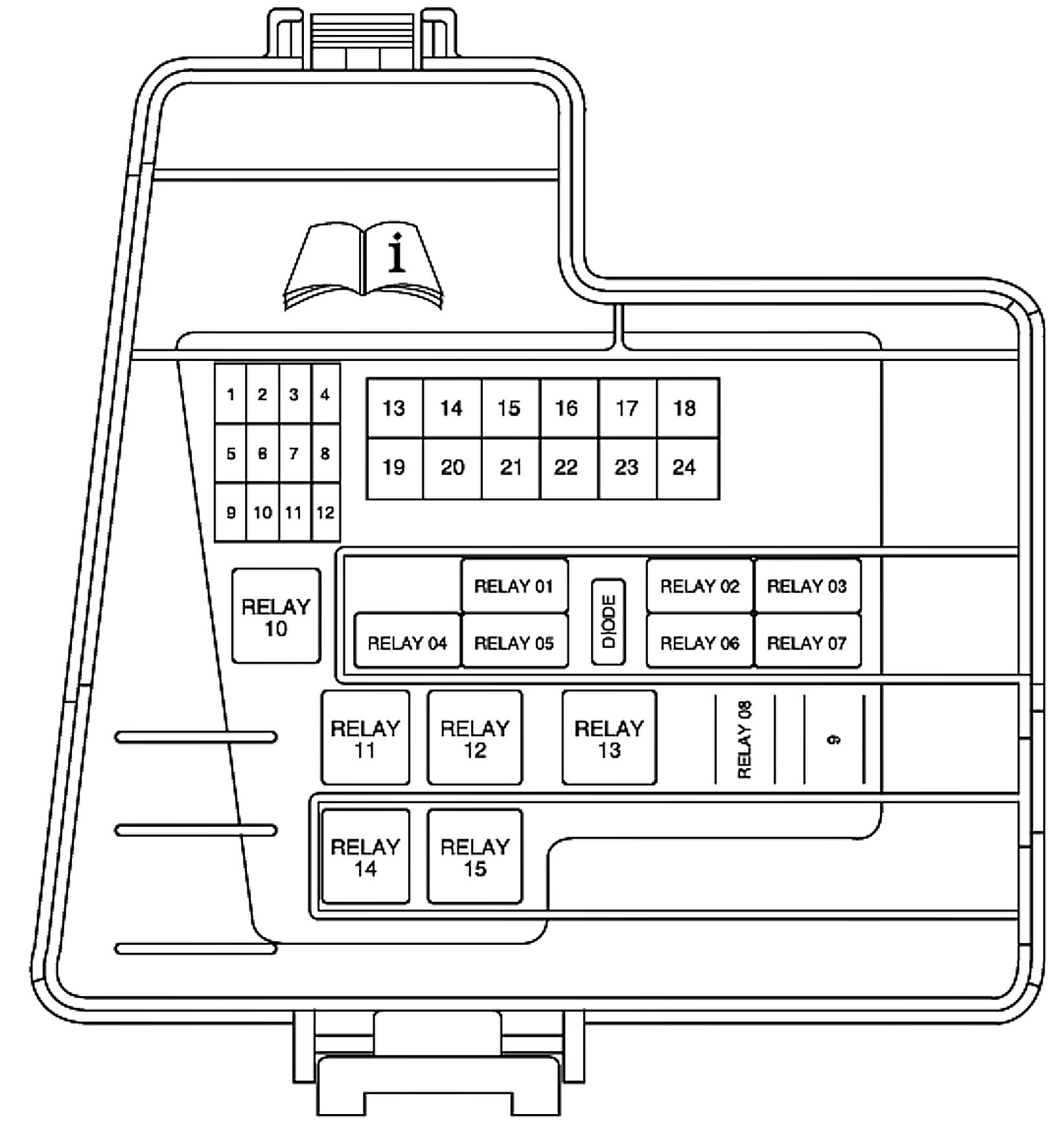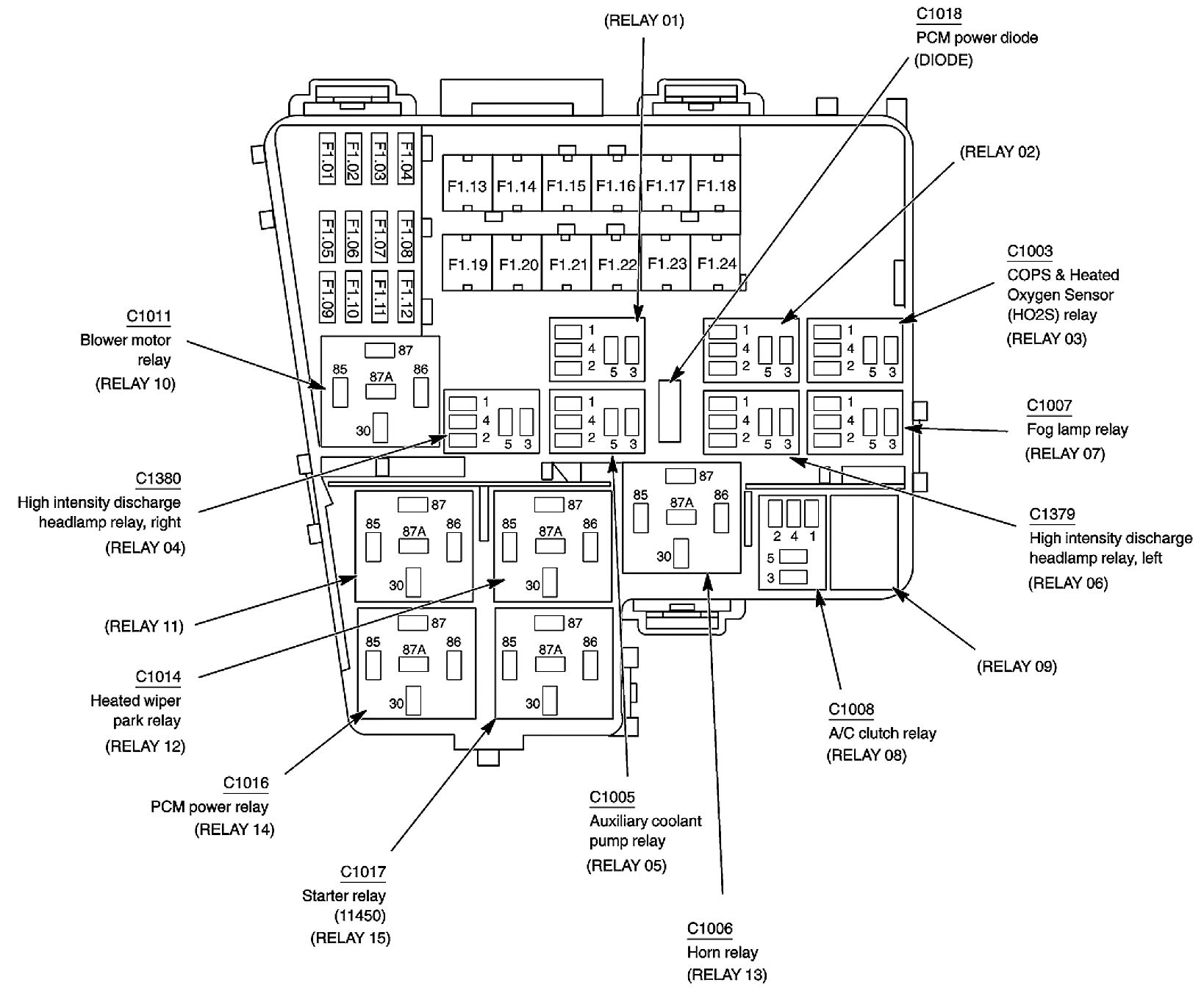 ALLDATA Editor's Note: Ford identifies this one component by 2 different names. Users have reported success comparing these images to determine Application/ID or Location of Fuses and Relays with the Front Power Distribution Box / Auxiliary Junction Box (AJB), underhood.