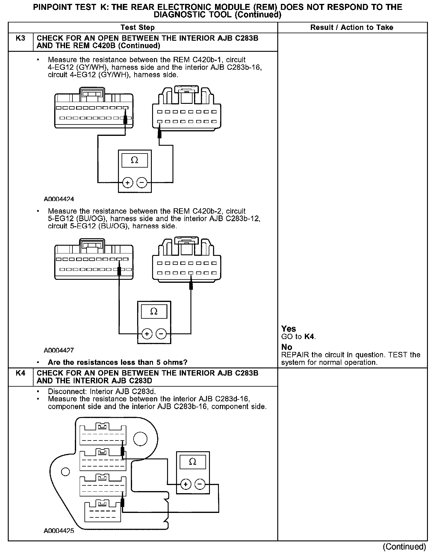 The total resistance values must not be more than 5 ohms. If the resistance is more than 5 ohms, there is either an open in circuits 4-EG12 (GY/WH) and 5-EG12 (BU/OG), damage to the DLC C251, damage to the REM 420b, or a problem in the interior AJB C283b, interior AJB C283d or joint connector No. 4 C223.