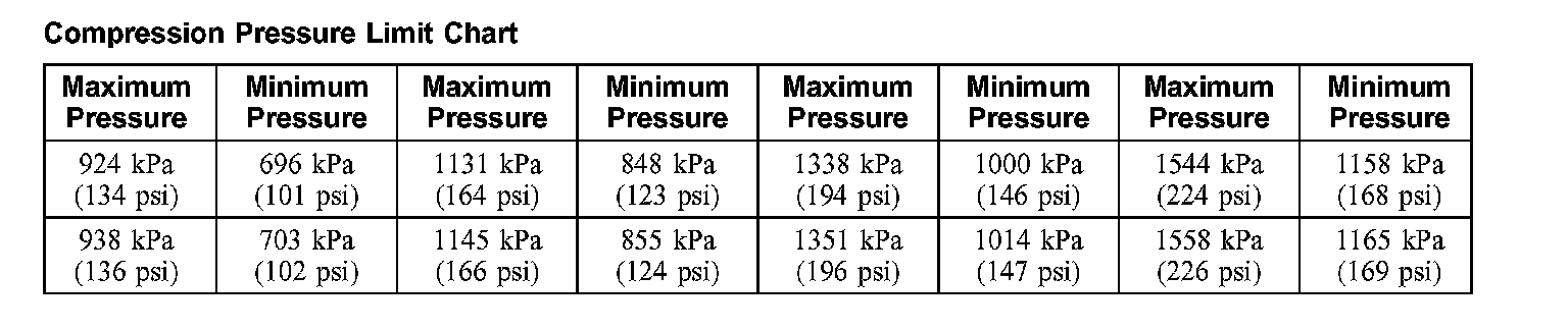 The indicated compression pressures are considered within specification if the lowest reading cylinder is at least 75 percent of the highest reading. For additional information, refer to the Compression Pressure Limit Chart.
