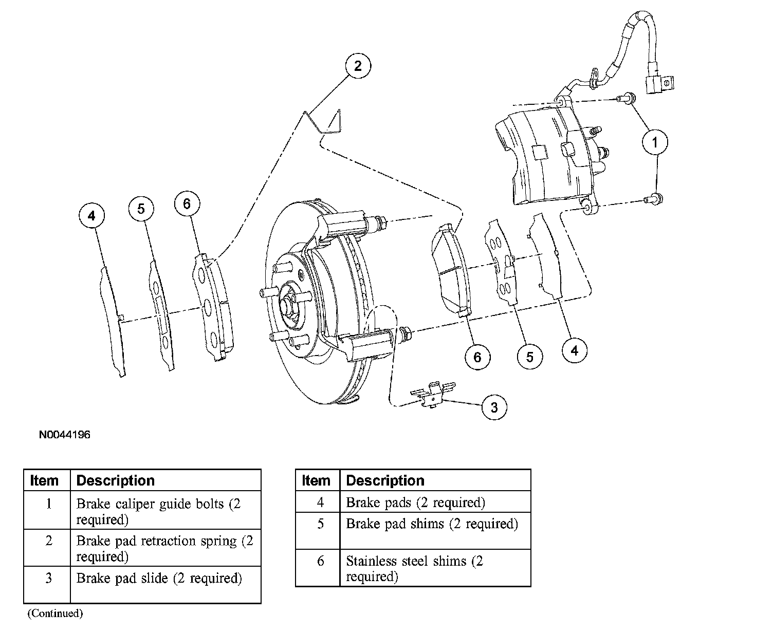 CAUTION: Do not allow the brake caliper to hang from the brake hose or damage to the hose can occur.
