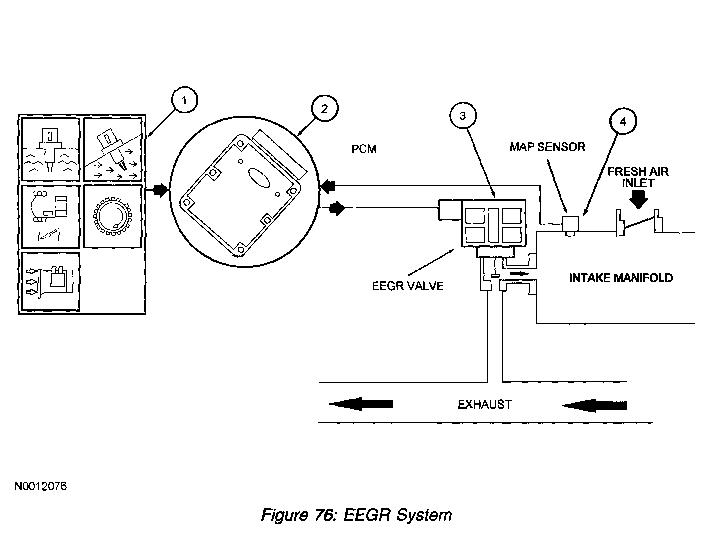 1. The EEGR system receives signals from the engine coolant temperature (ECT) or cylinder head temperature (CHT) sensor, throttle position (TP) sensor, mass air flow (MAF) sensor, crankshaft position (CKP) sensor, and the MAP sensor to provide information on engine operating conditions to the PCM. The engine must be warm, stable, and running at a moderate load and RPM before the EEGR system is activated. The PCM deactivates the EEGR during idle, extended wide open throttle (WOT), or whenever a concern is detected in an EEGR component or EGR required input.