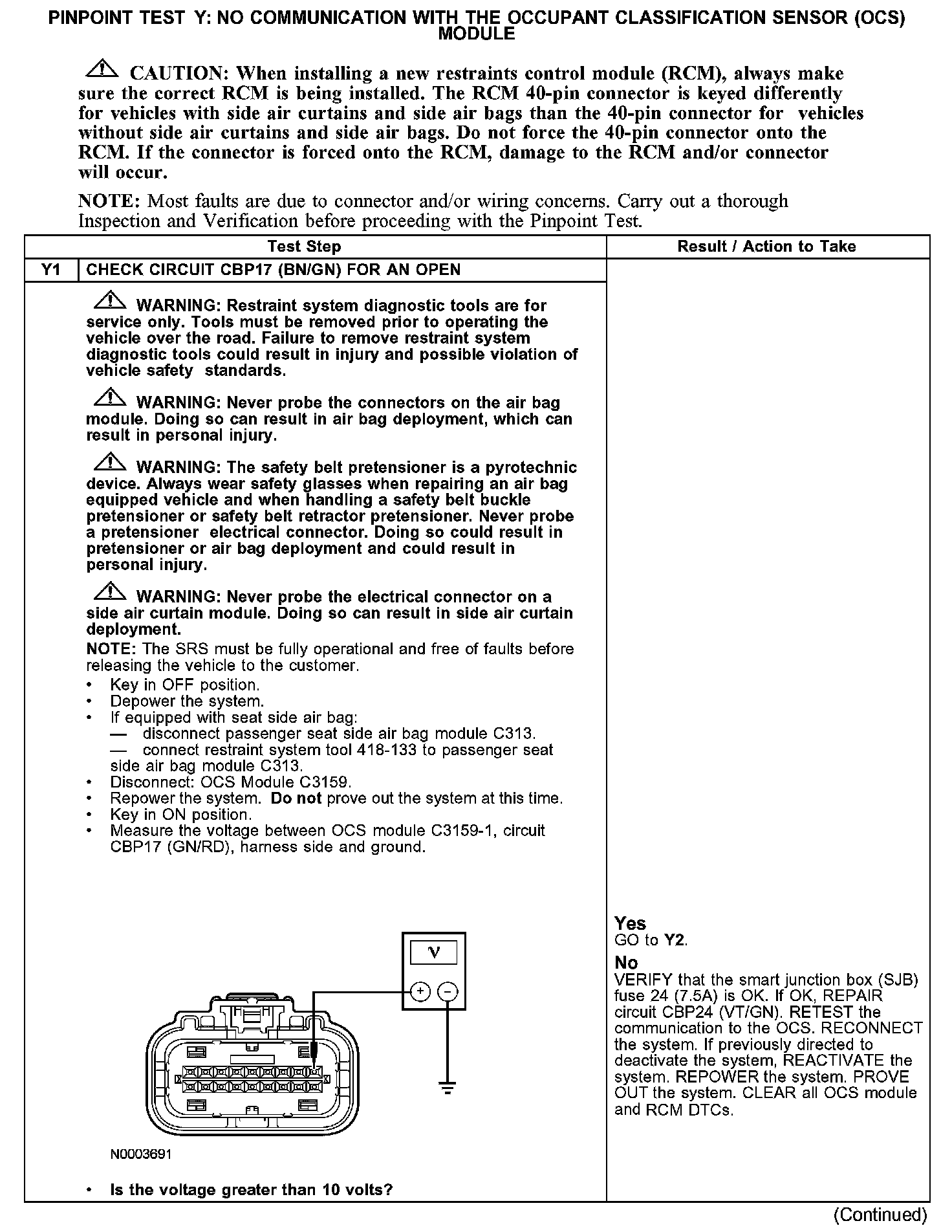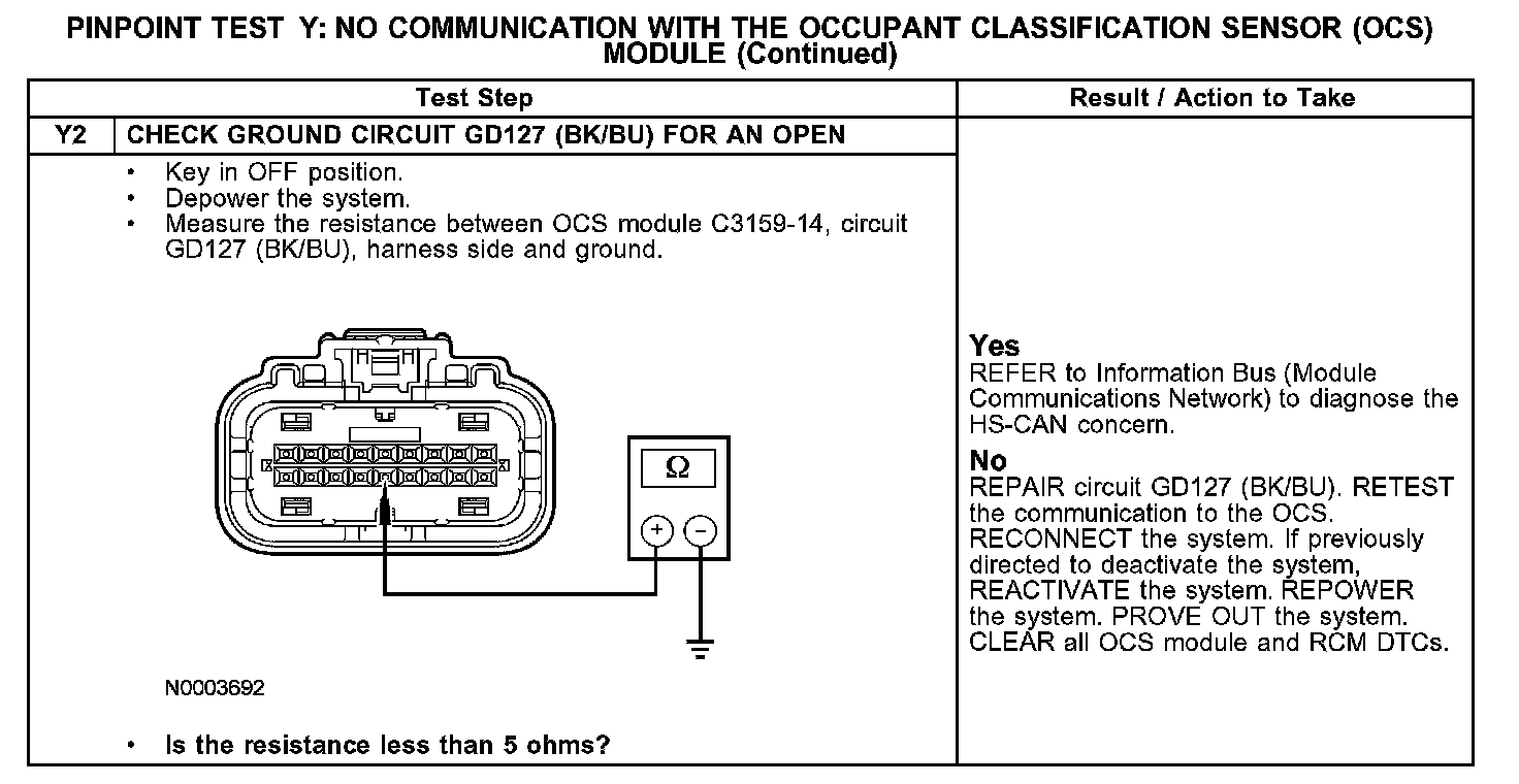 PINPOINT TEST Y: NO COMMUNICATION WITH THE OCCUPANT CLASSIFICATION SENSOR (OCS) MODULEY1: