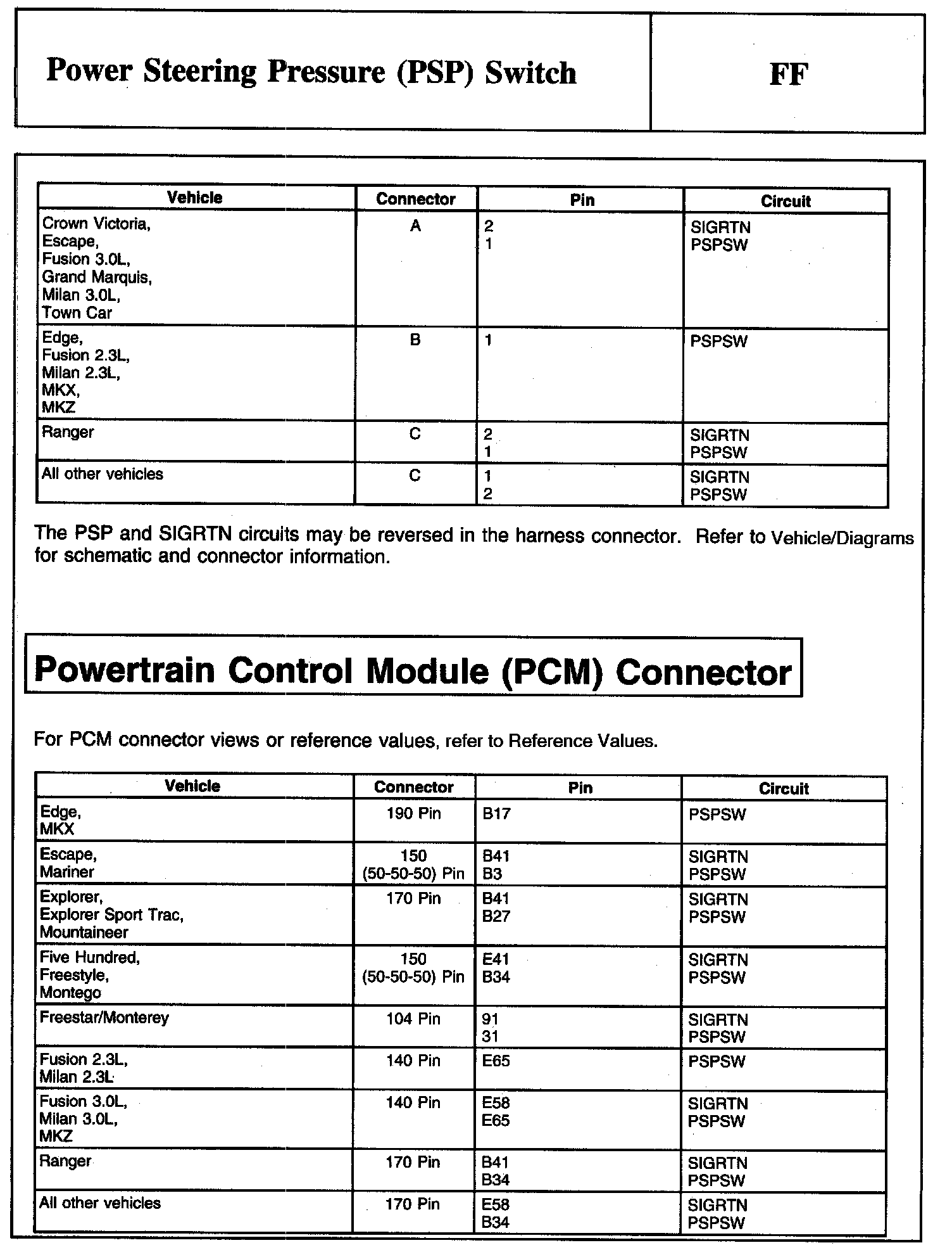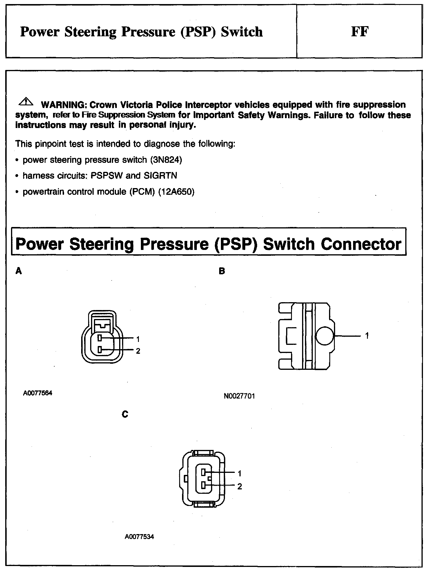 PINPOINT TEST FF: POWER STEERING PRESSURE (PSP) SWITCHWarning And Power Steering Pressure (PSP) Switch Connector: