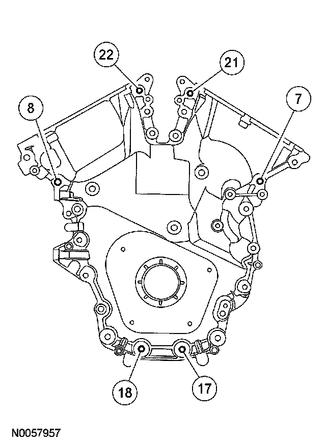 NOTE: The remainder of the engine front cover bolts (1, 2, 3, 4, 5, 6, 9, 10, 11, 12, 13, 14, 15, 16, 19 and 20) must be installed and tightened within 60 minutes of the initial sealant application.