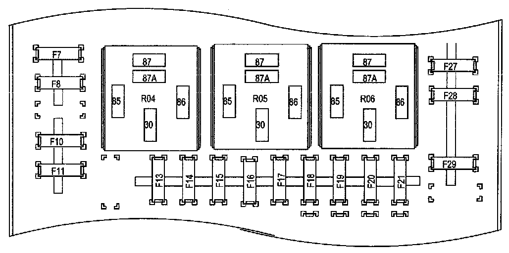 Fuse and Relay Information contains a view of the fuse/relay box in which fuses and relays are identified, numbered and named. Fuse and relay numbering and naming follow the indication of the fuse panel cover.