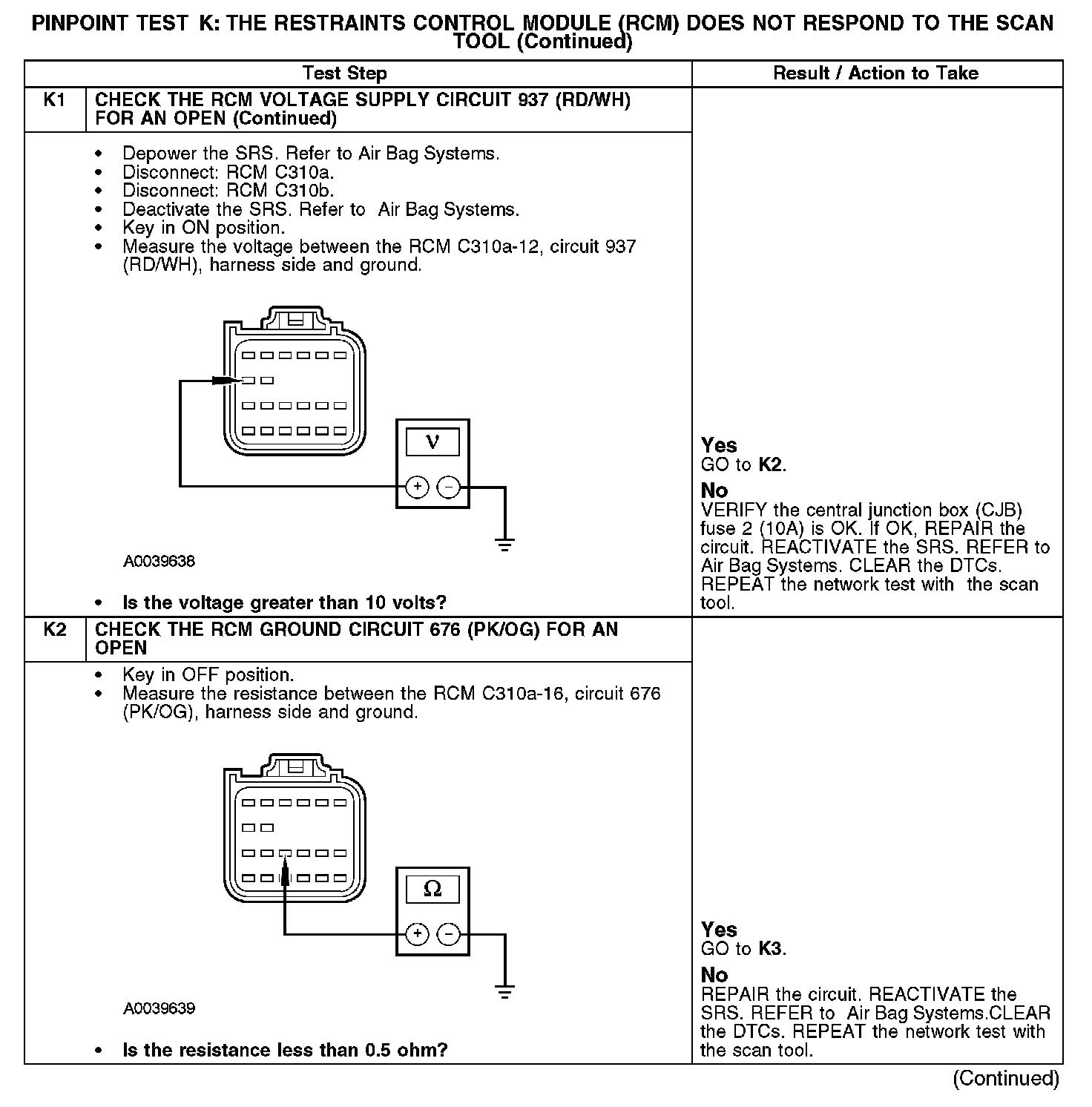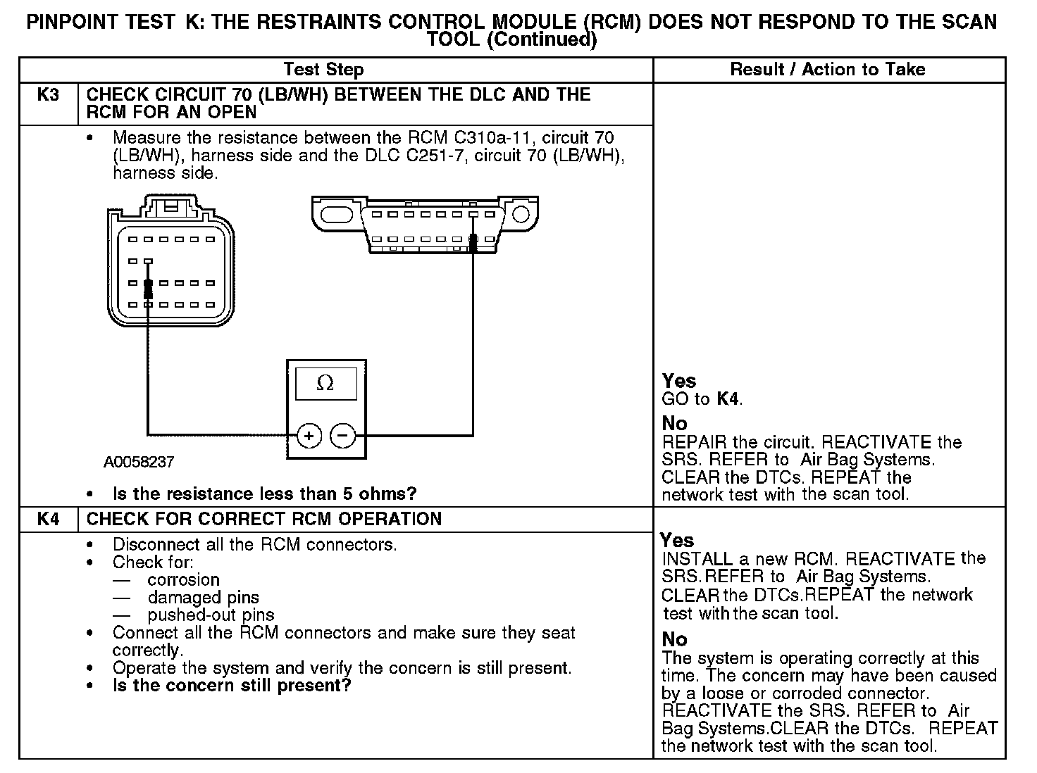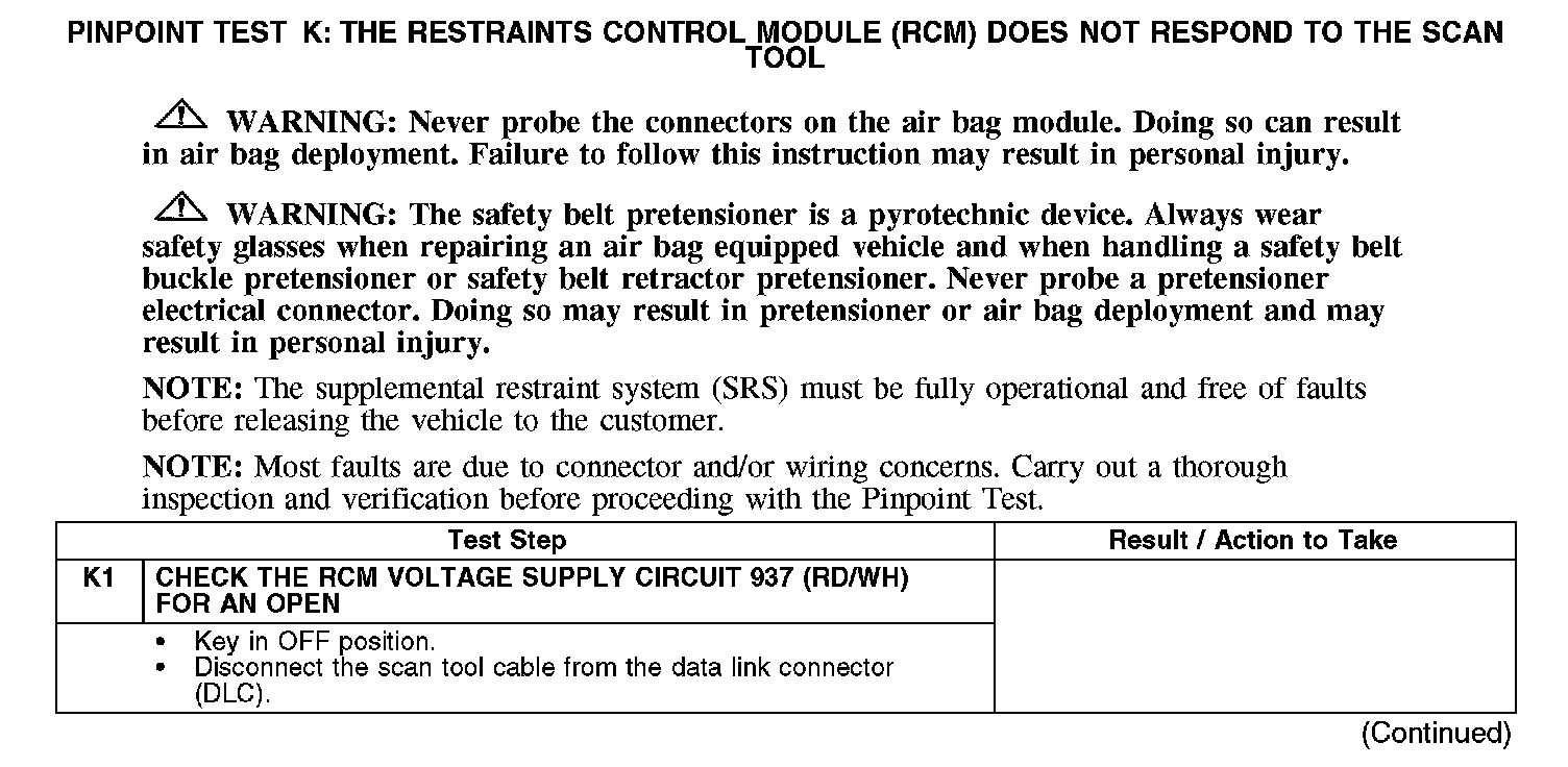 PINPOINT TEST K: THE RESTRAINTS CONTROL MODULE (RCM) DOES NOT RESPOND TO THE SCAN TOOL