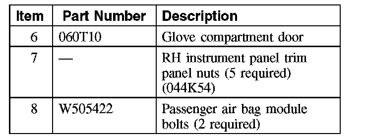 6. Through the glove compartment opening, remove the 2 passenger air bag module bolts.