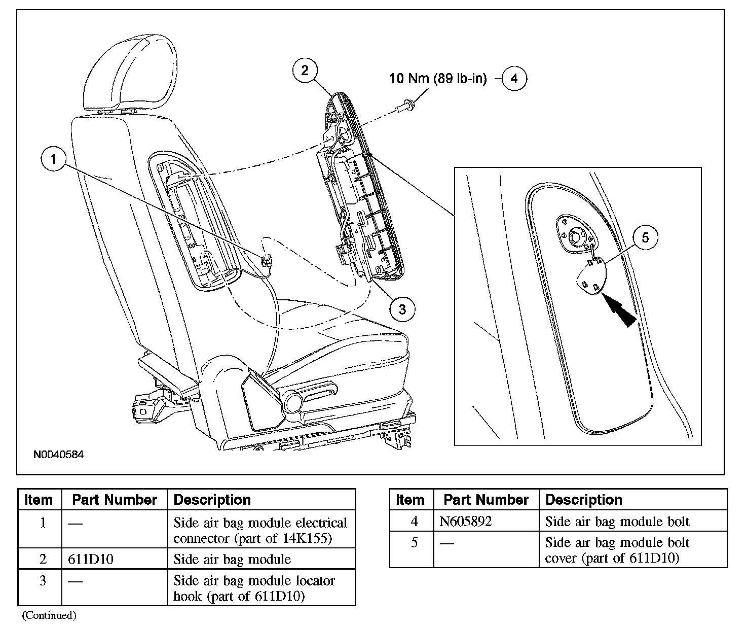 - When installing a new side air bag after deployment, refer to Seats for additional information concerning the installation of a new side air bag.