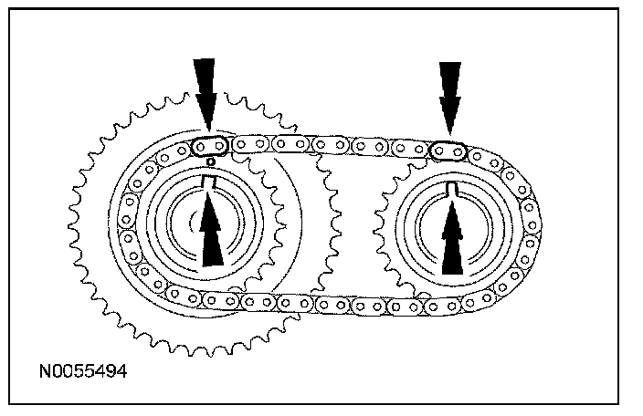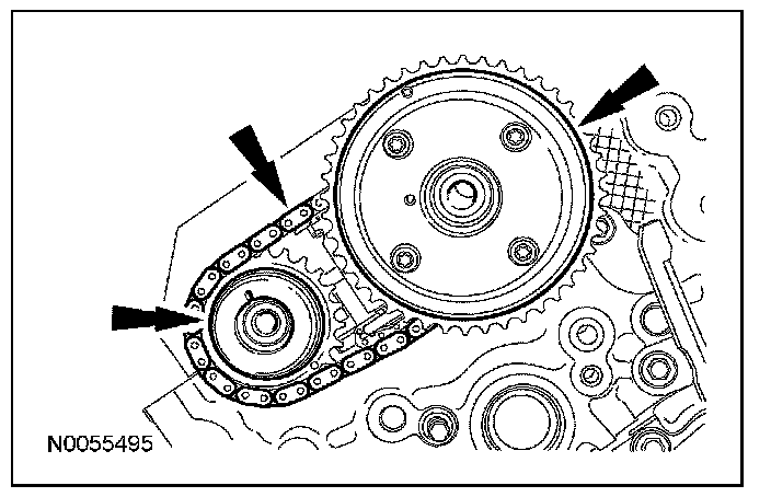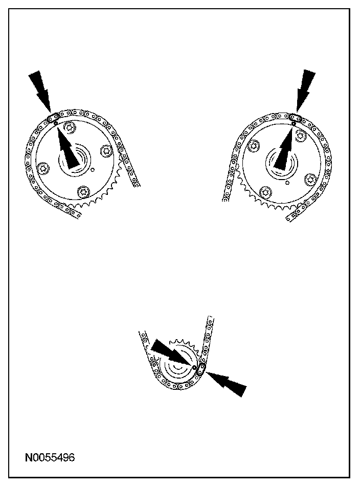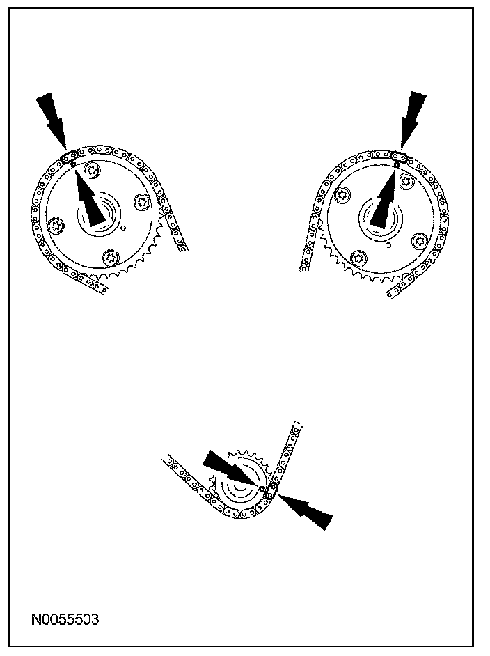 13. Install the primary timing chain with the colored links aligned with the timing marks on the VCT assemblies and the crankshaft sprocket.