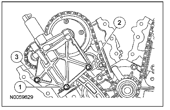 7. NOTE: It is necessary to tilt the special tool toward the rear of the engine to access the rearmost secondary timing chain tensioner bolt.