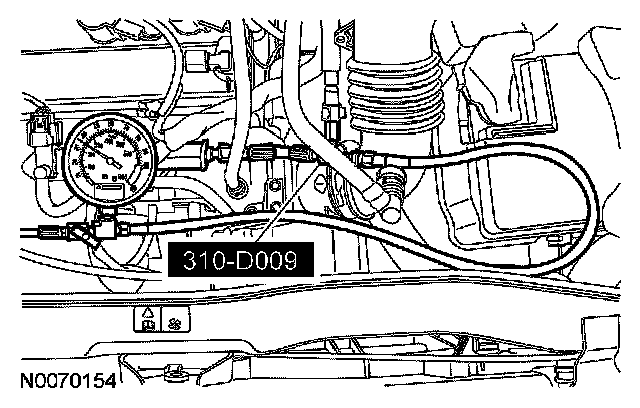 - After completion of the fuel system pressure test, open the drain valve on the special tool and release any residual fuel into a suitable container prior to removing the tool.