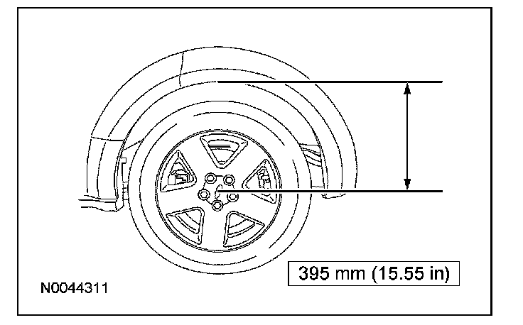 15. CAUTION: Before tightening any suspension bushing fasteners, the suspension must be at the bushing fastener tightening position. Use a suitable jack to raise the suspension until the distance between the center of the hub and the lip of the fender is equal to 395 mm (15.55 in). This will prevent incorrect clamp load and bushing damage.