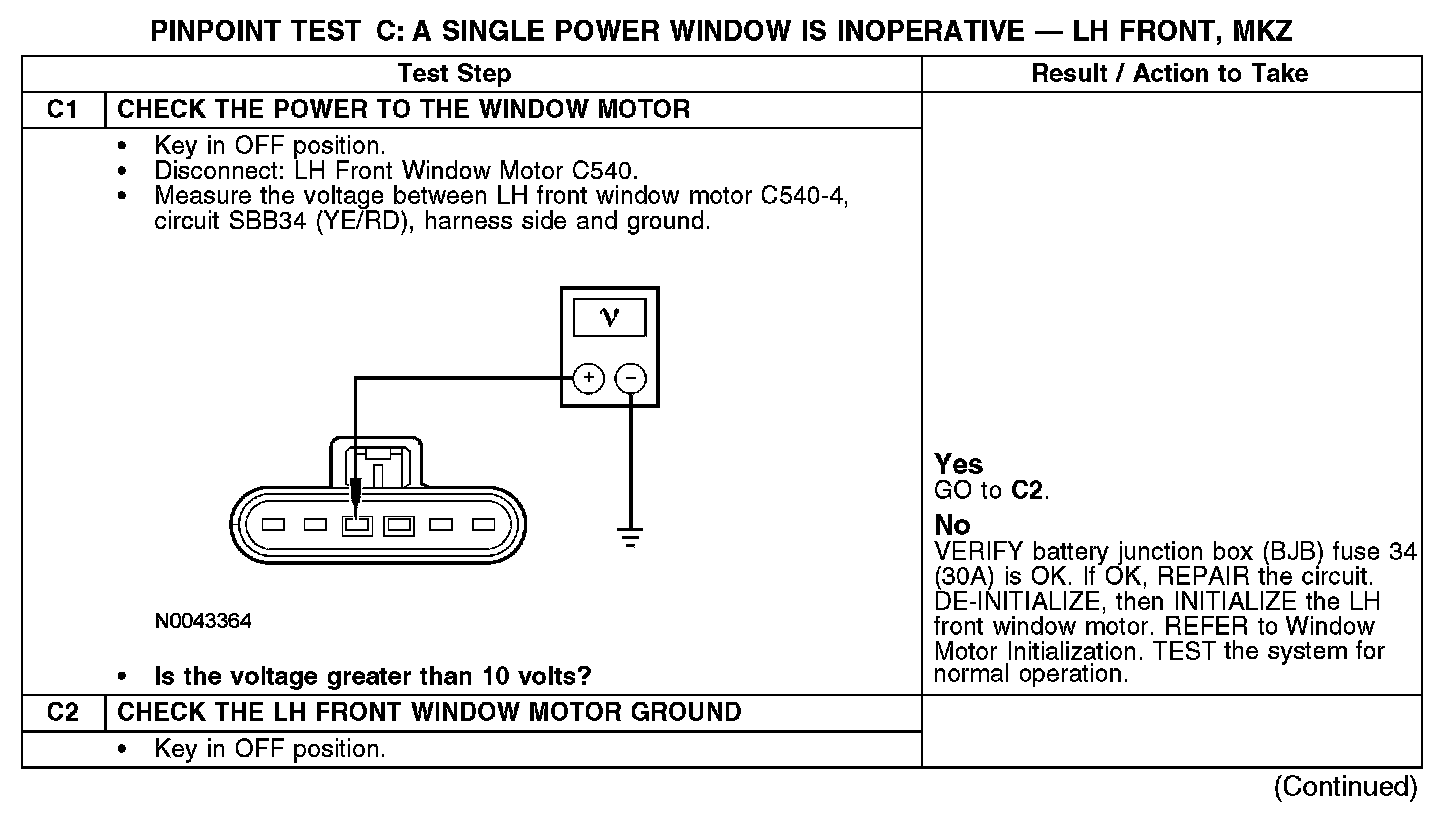 PINPOINT TEST C: A SINGLE POWER WINDOW IS INOPERATIVE - LH FRONTNOTE: