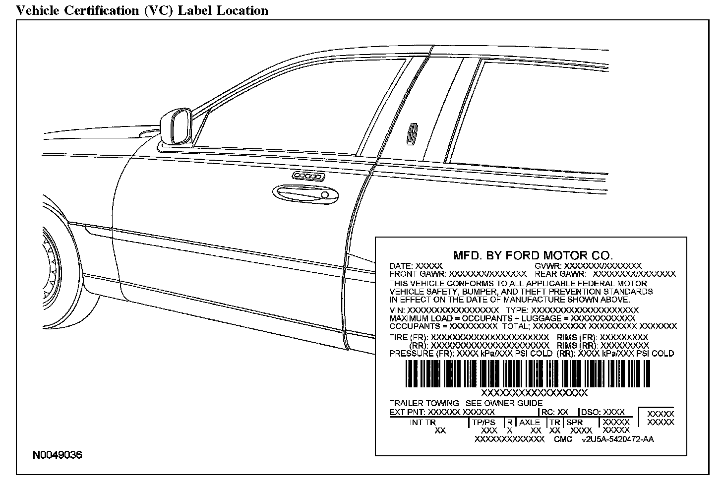 The upper portion of the VC label contains the manufacturer name, the month and year of manufacture, the certification statement and the VIN. It also includes gross vehicle weight ratings (GVWR). The VC label is located on the front left-hand door jamb.