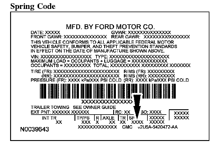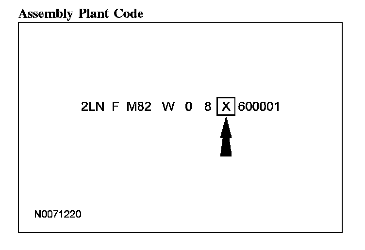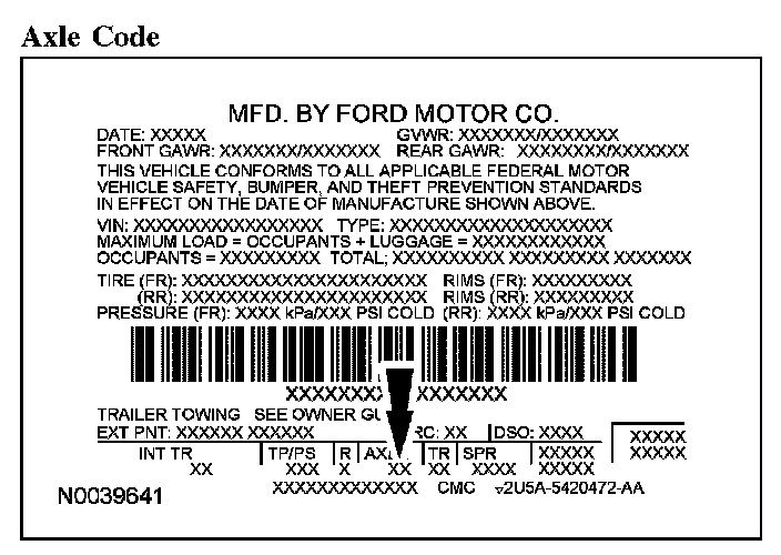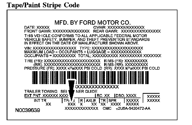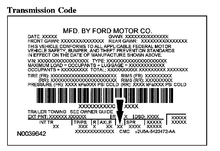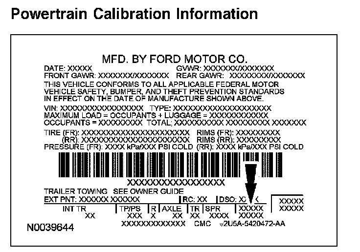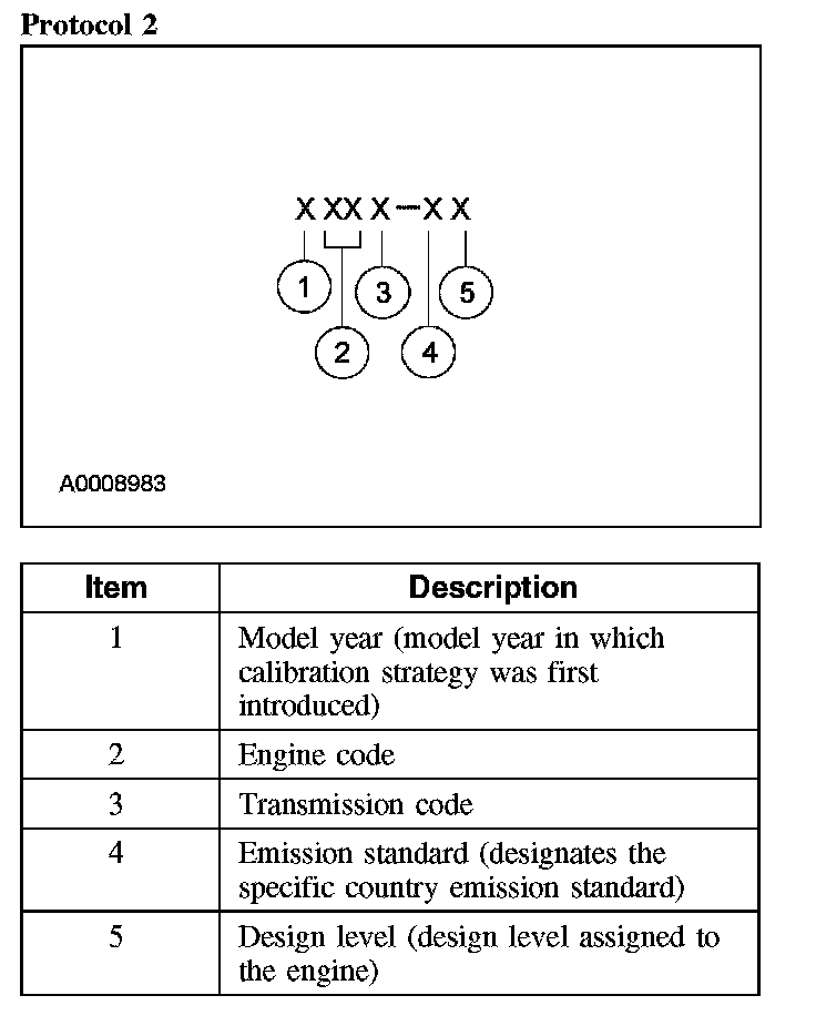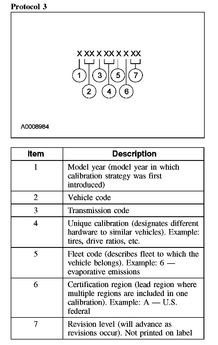 Powertrain calibration information is printed in the lower right corner of the VC label. Only the base calibration information is printed. Revision levels will not appear, however, they can be found in OASIS. For the current model year, Ford Motor Company is using 3 different protocols which describe powertrain base calibration. These protocols are designed to provide worldwide standardization for vehicle calibration. If the electronic calibration strategy has been used since 1998 and carried into the current model year, Protocol 1 will be used. Refer to Protocol 1 below. If the electronic calibration strategy has been used since 1999 and is carried into the current model year, Protocol 2 will be used. Refer to Protocol 2 below. For electronic calibration strategies introduced since the 2000 model year, use Protocol 3. Refer to Protocol 3 below.