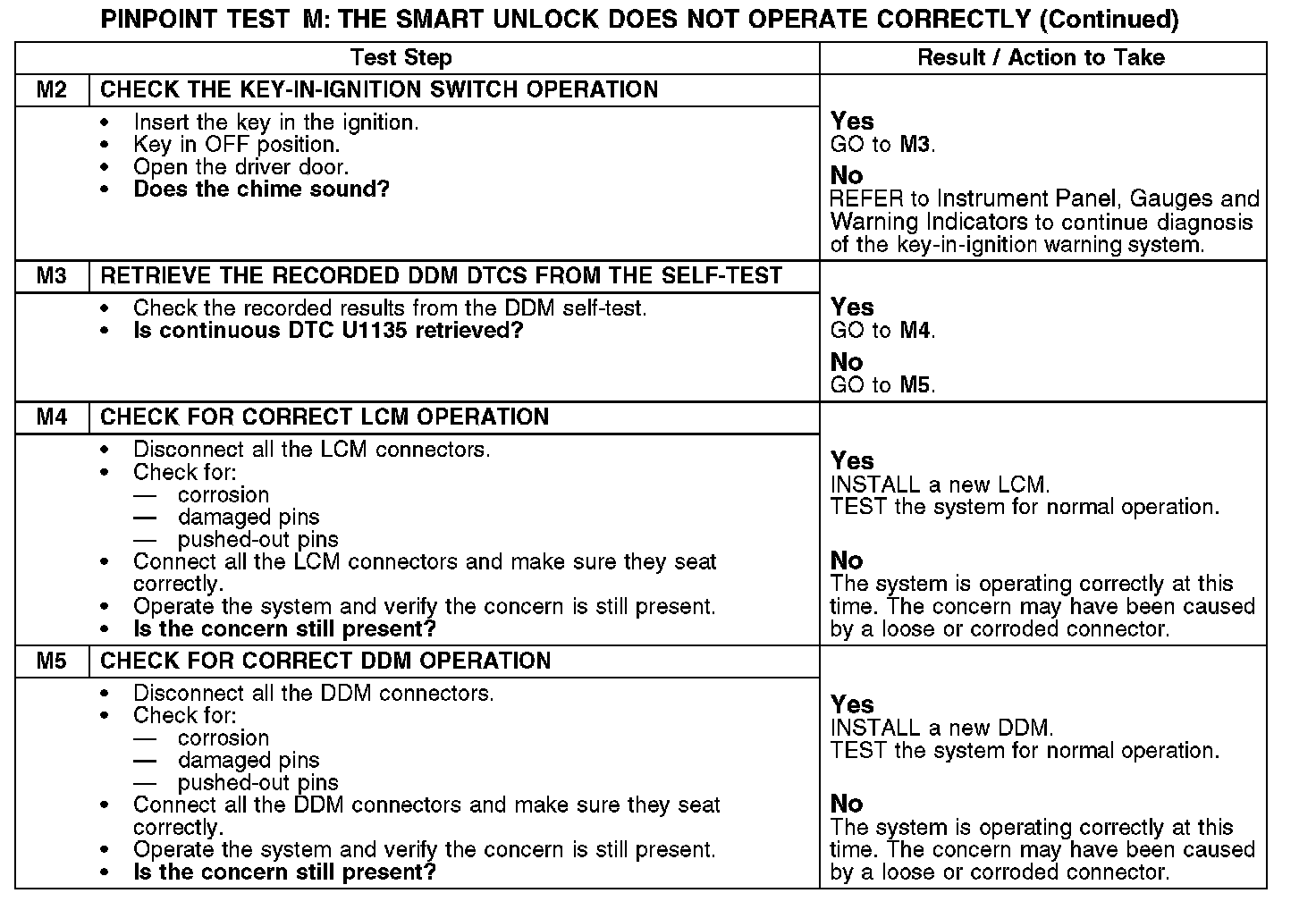 The lighting control module (LCM) sends a network message to the driver door module (DDM) that the key is in the ignition. If the DDM does not receive or receives invalid data for the key-in ignition from the LCM, it will set DTC U1135. The DDM monitors the network message, the door lock control switch and the LH front door ajar switch. If the key is in the ignition and the LH front door is open when the vehicle is locked with a door lock control switch, the DDM unlocks the LH front door. The smart unlocking feature unlocks the LH front door 1 second after these conditions are met. The vehicle may still be locked with the key in the ignition using the manual lock button, a remote keyless entry (RKE) transmitter, the keyless entry keypad or a key in the driver door lock cylinder.