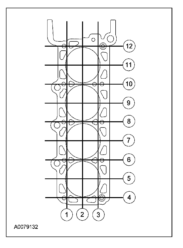 Using a straightedge and a feeler gauge, inspect the cylinder head for flatness in the sequence shown.