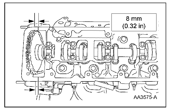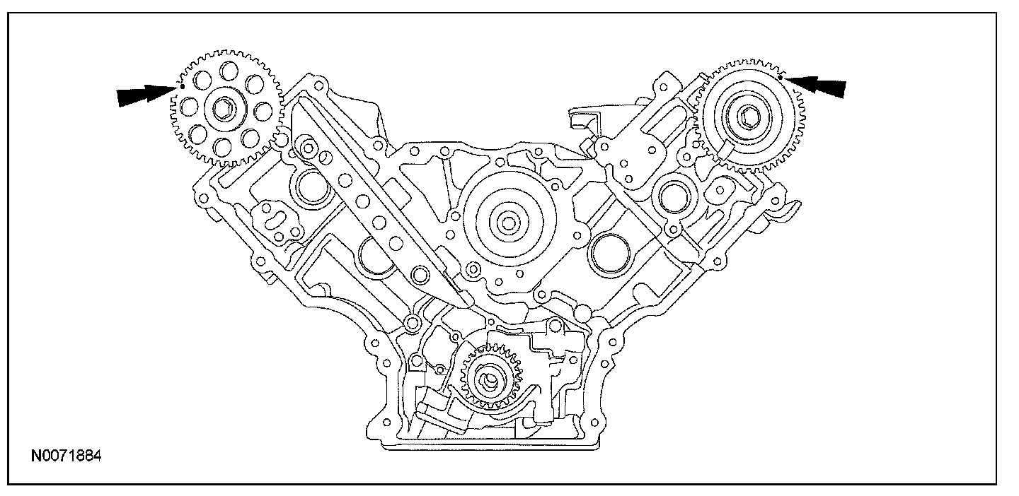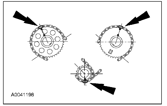 42. Rotate the RH camshaft sprocket until the timing mark is approximately at the 11 o'clock position. Rotate the LH camshaft sprocket until the timing mark is approximately at the 1 o'clock position.