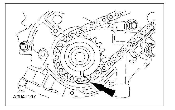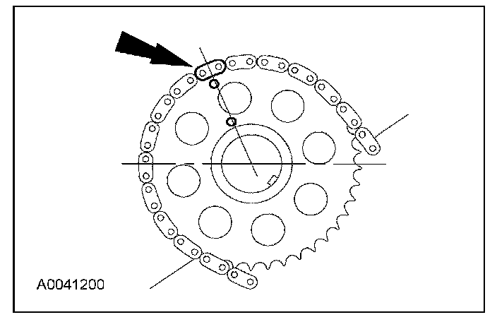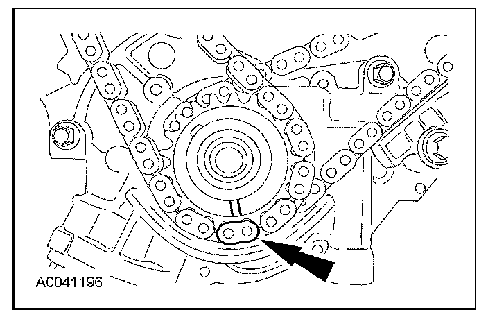 43. Position the LH (inner) timing chain on the crankshaft sprocket, aligning the colored (marked) link with the timing mark on the sprocket.
