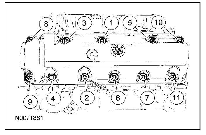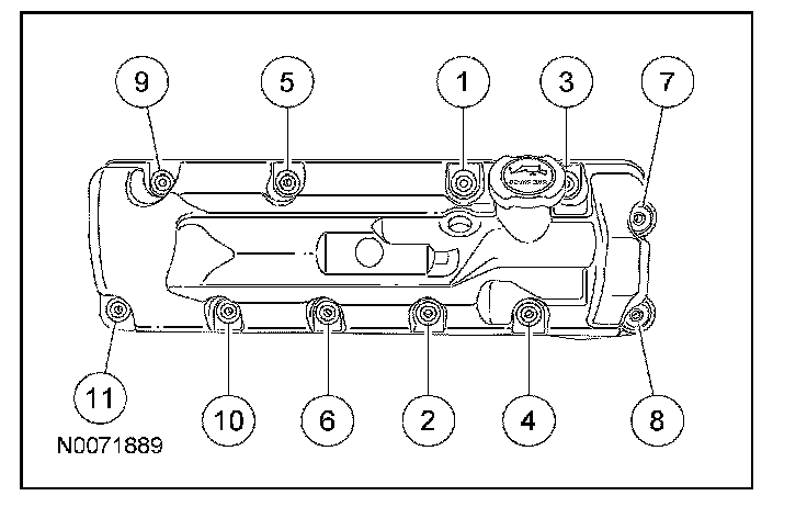 78. Install the new RH gasket into the valve cover and position on the cylinder head. Tighten the 11 bolts in the sequence shown.
