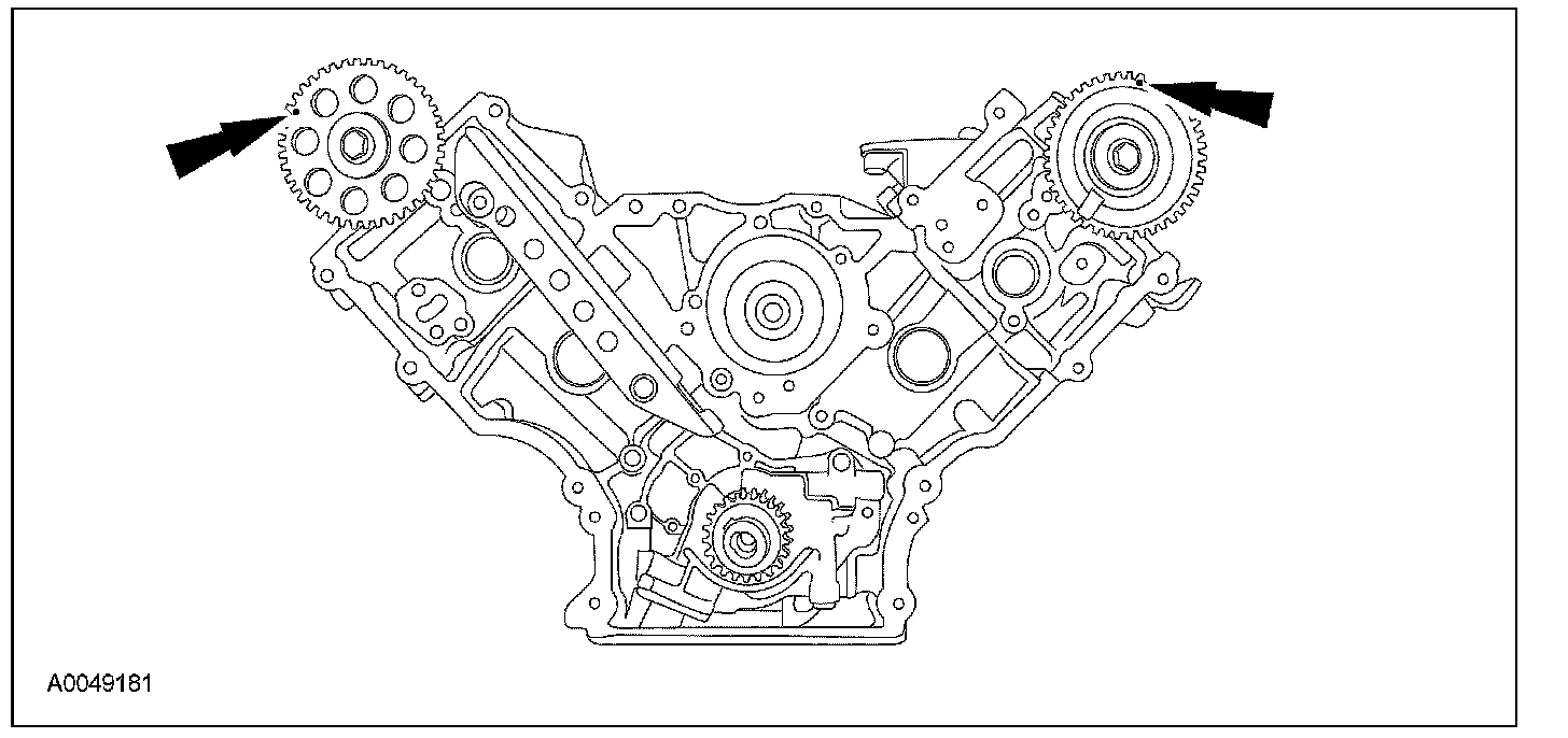 13. Rotate the RH camshaft sprocket until the timing mark is approximately at the 11 o'clock position. Rotate the LH camshaft sprocket until the timing mark is approximately at the 12 o'clock position.