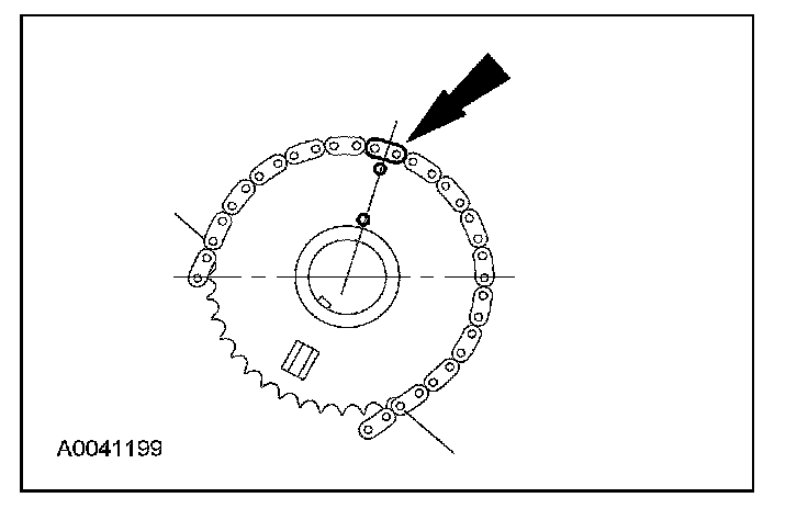 14. Position the LH (inner) timing chain on the crankshaft sprocket, aligning the colored (marked) link with the timing mark on the sprocket.