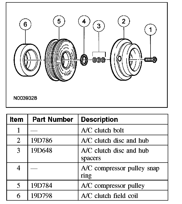 A/C COMPRESSOR AND CLUTCH ASSEMBLYNOTE: Internal FS18 A/C compressor components are not serviced separately. The A/C compressor is serviced only as an assembly. The clutch disc and hub, A/C compressor pulley and bearing, and clutch field coil are serviceable.