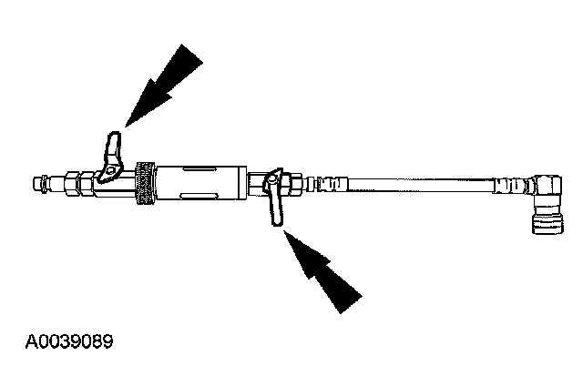 5. Install the dye/lubricant injector between the low-side service gauge port valve and the refrigerant service station or manifold gauge set.
