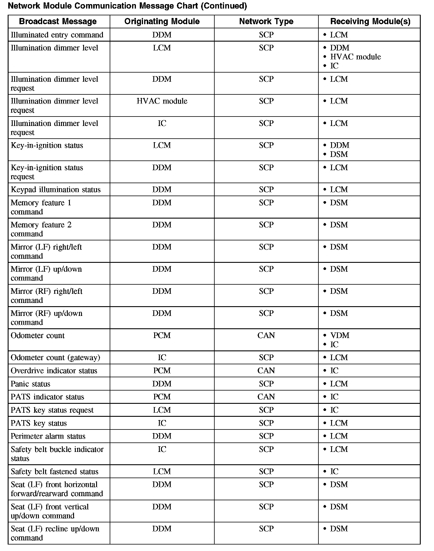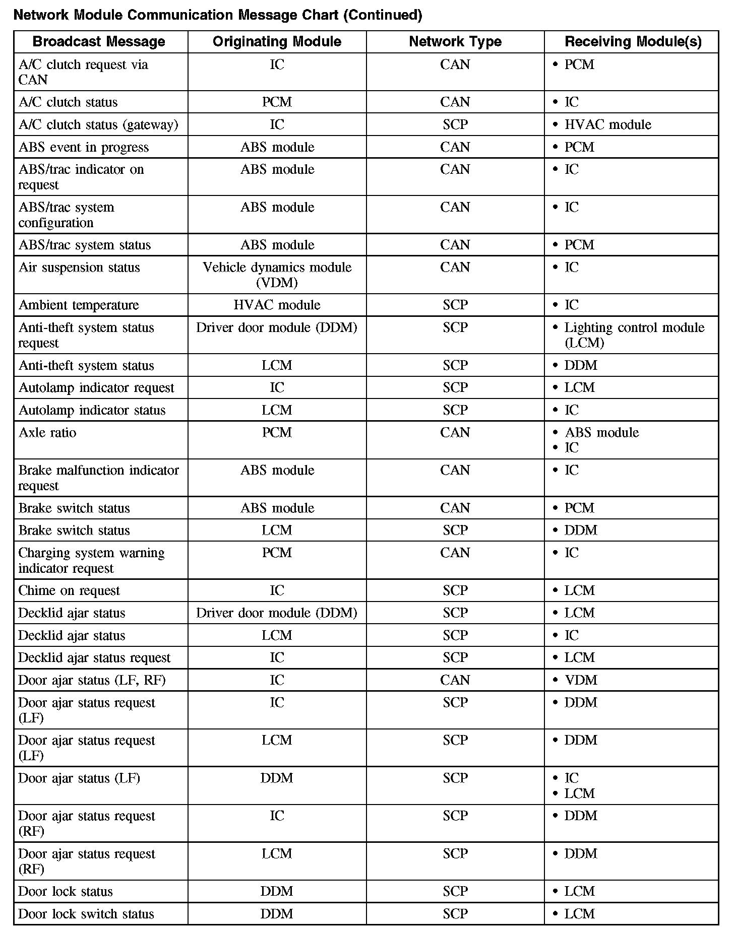 The following chart describes all network messages broadcast on the standard corporate protocol (SCP) and controller area network (CAN) and the module(s) that receive the message: