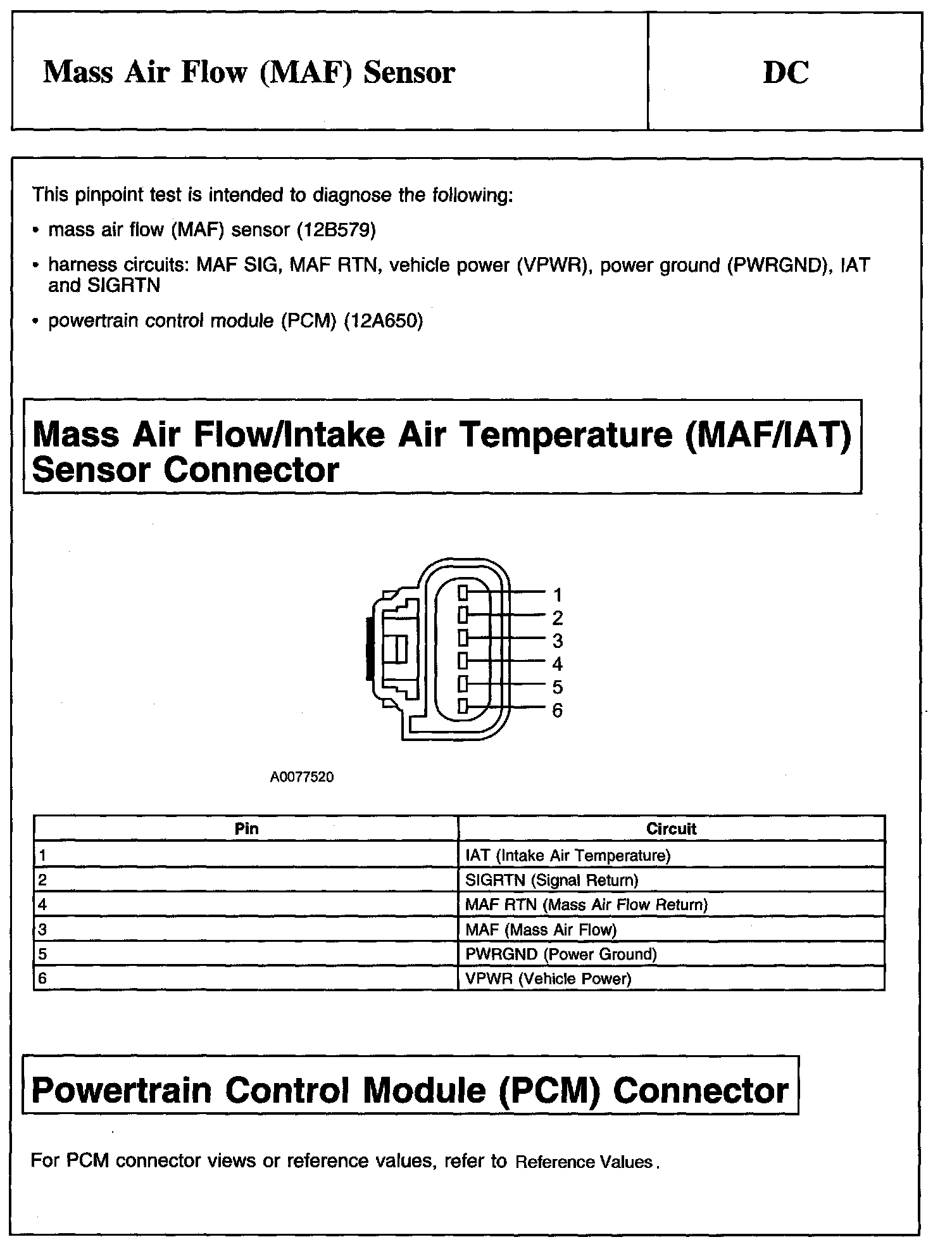 PINPOINT TEST DC: MASS AIR FLOW (MAF) SENSORDescription, Mass Air Flow/Intake Air Temperature (MAF/IAT) Sensor Connector And Powertrain Control Module (PCM) Connector: